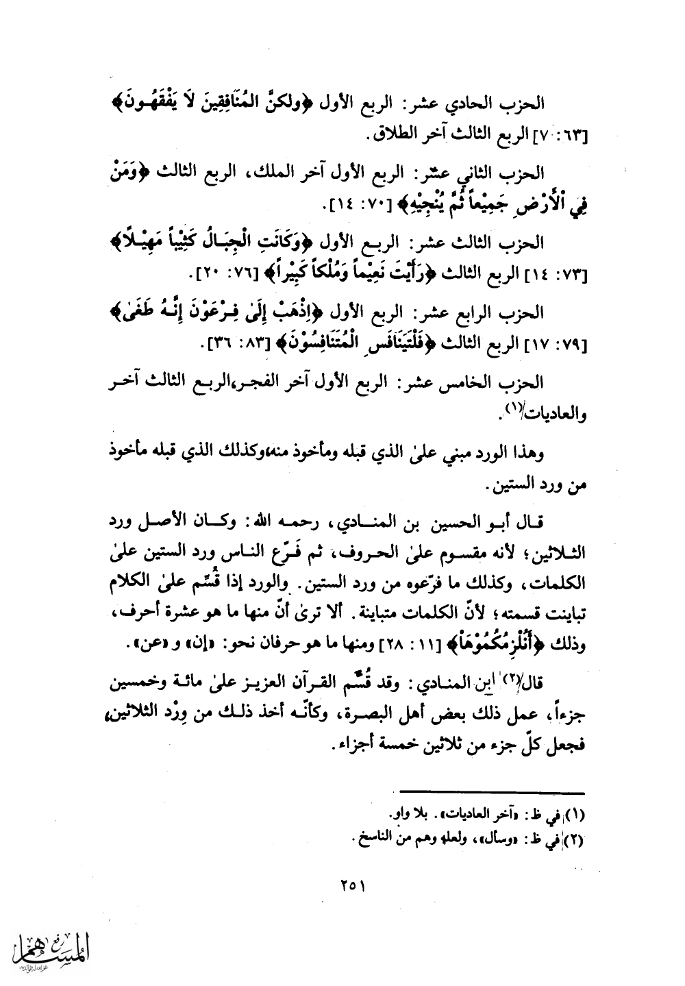 قال ابن المنادي: وقد قُسّم القرآن العزيز على مائة وخمسين