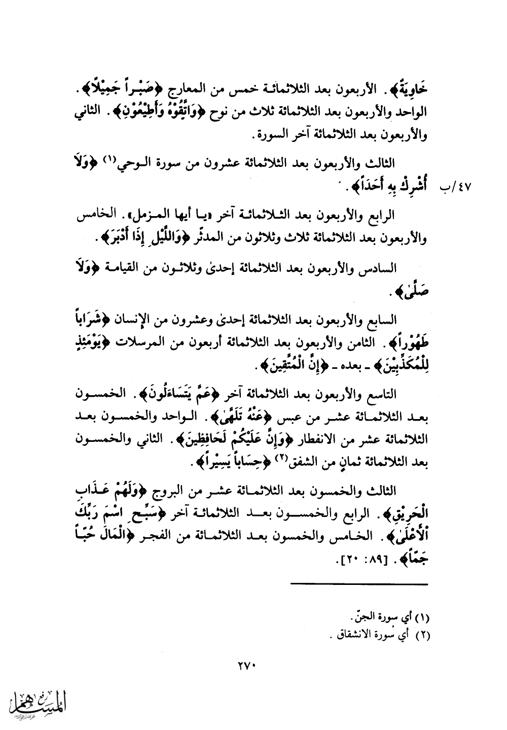الواحد والخمسون بعد الثلاثمائة عشر من الانفطار (وَإِنَّ عَلَيْكُم لَحَافِظِينَ) . الثاني والخمسون بعد الثلاثمائة ثمان من الشفق (حِسَاباً يَسِيْراً) .