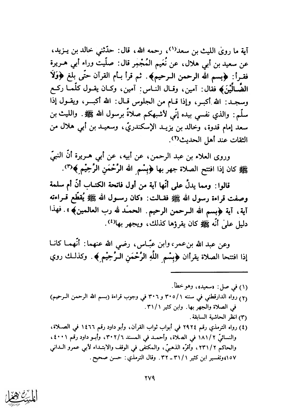 وروى العلاء بن عبد الرحمن، عن أبيه، عن أبي هريرة أن النبي - صلى الله عليه وسلم - كان إذا افتتح الصلاة جهر بها (بِسْمِ اللَّهِ الرَّحْمَنِ الرَّحِيمِ) .