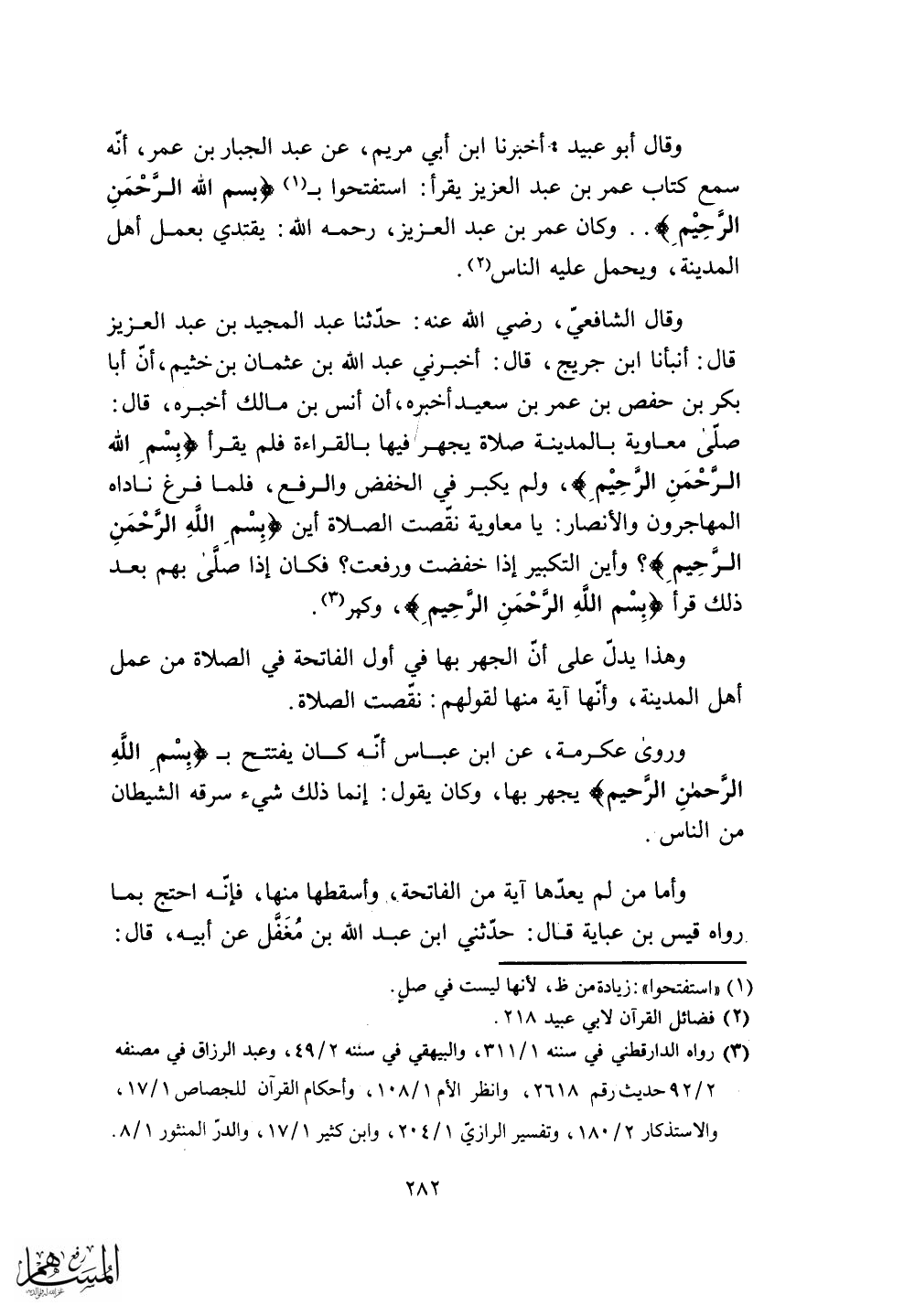 وهذا يدل على أن الجهر بها في أول الفاتحة في الصلاة من عمل