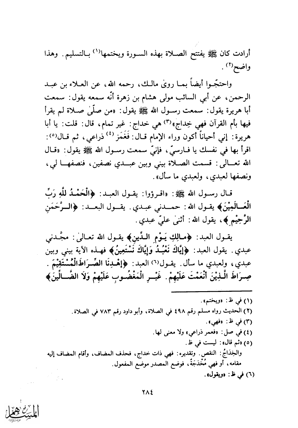 "من صلَّى صلاة لم يقرأ فيها بأم القرآن فهي خِدَاجٌ هي خِدَاجٌ: غير تمام.