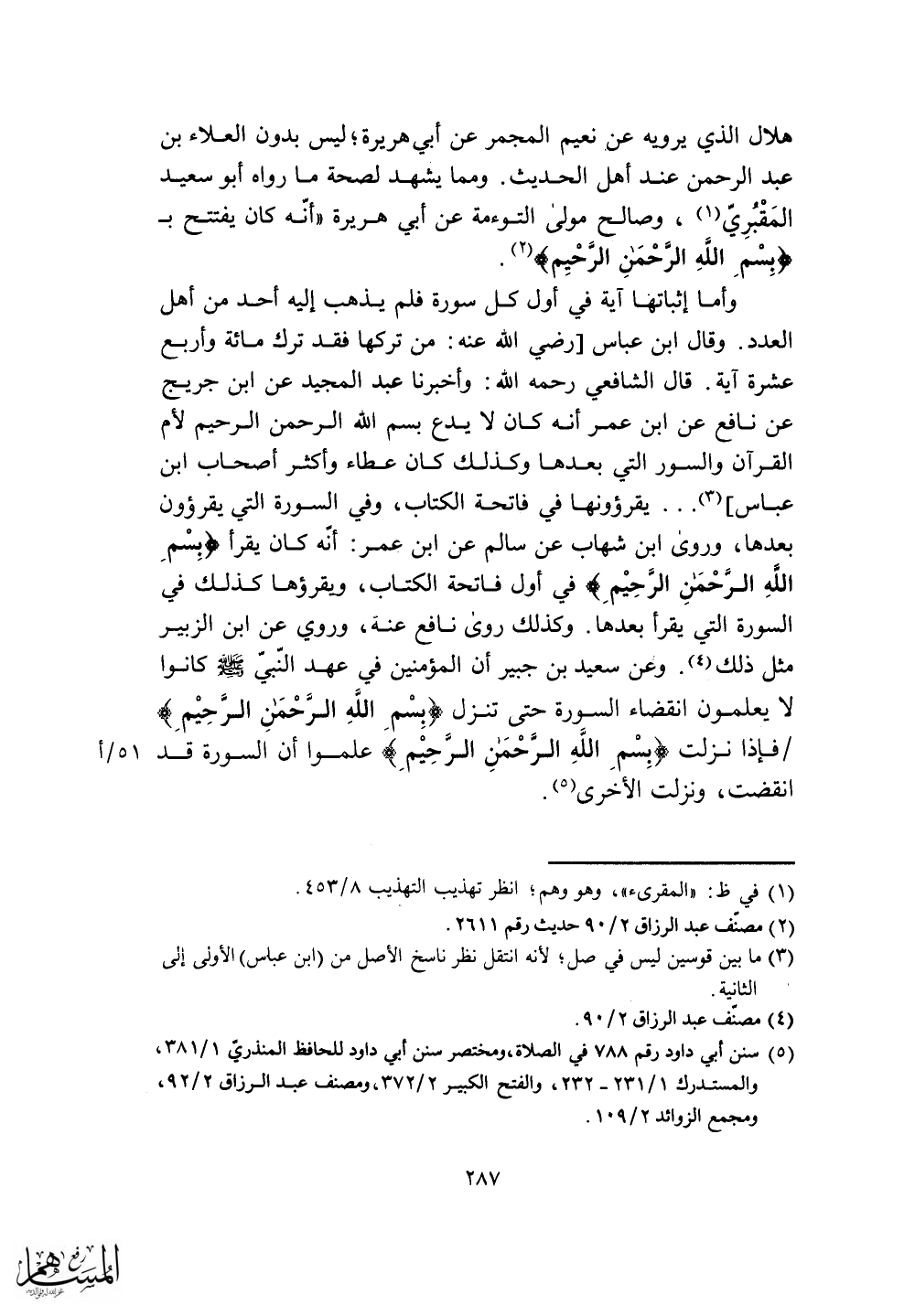 ومما يشهد لصحة ما رواه أبو سعيد المَقْبُرِيّ، وصالح مولى التوءمة عن أبي هريرة "أنّه كان يفتتح ب (بِسْمِ اللَّهِ الرَّحْمَنِ الرَّحِيمِ) .