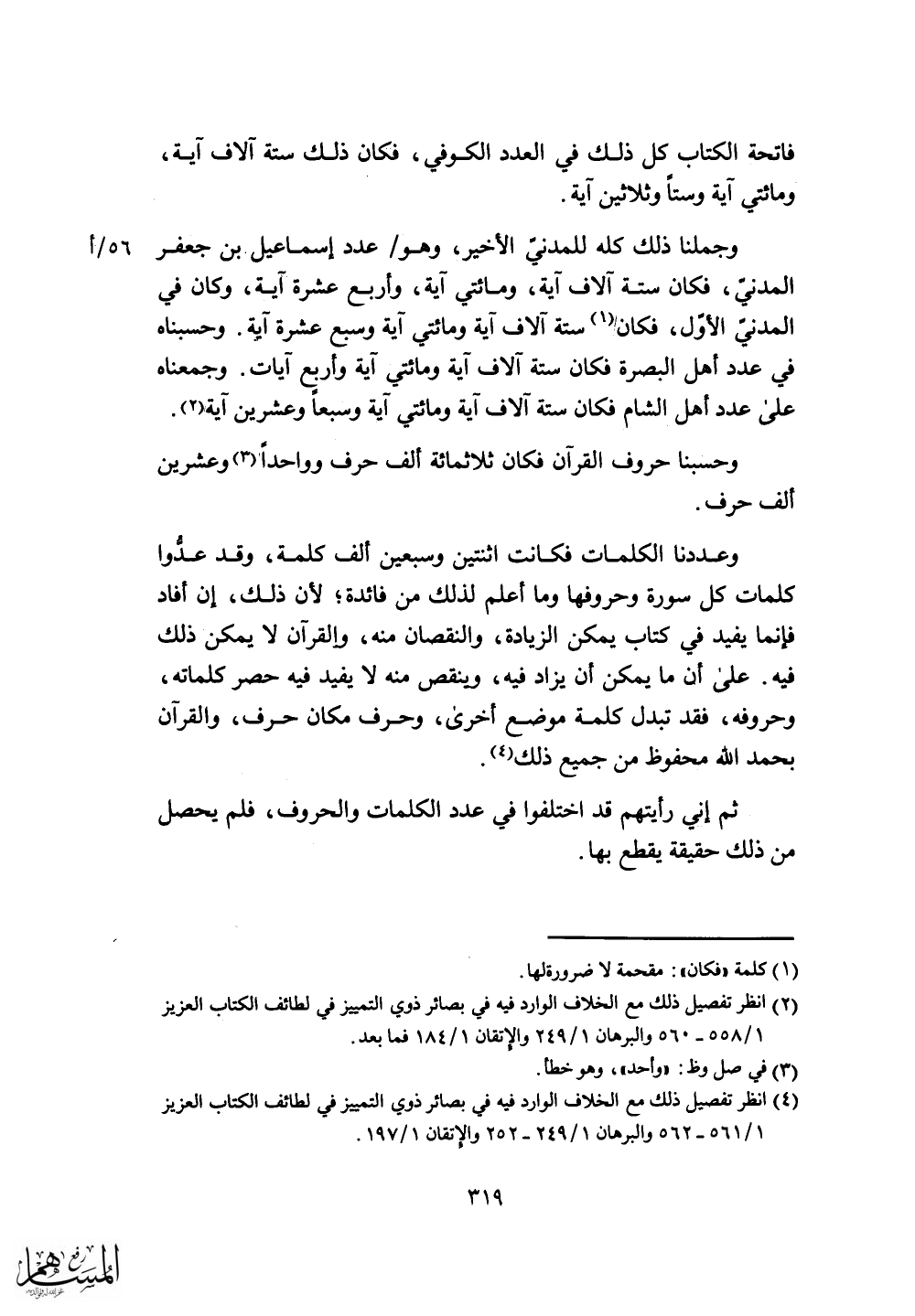 وحسبناه في عدد أهل البصرة فكان ستة آلاف آية ومائتي آية وأربع آيات. وجمعناه على عدد أهل الشام فكان ستة آلاف آية ومائتي آية وسبعا وعشرين آية.