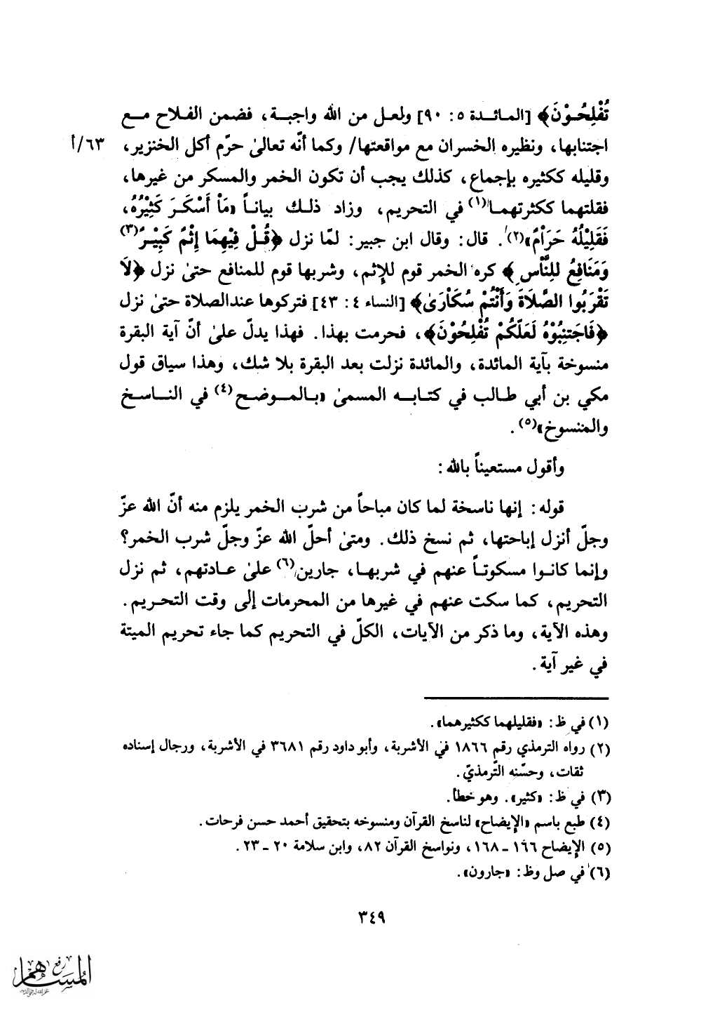 فتركوها عندالصلاة حتى نزل (فَاجْتَنِبُوهُ لَعَلَّكُمْ تُفْلِحُونَ) ، فحرمت بهذا. فهذا يدل على أن آية البقرة منسوخة بآية المائدة، والمائدة نزلت بعد البقرة بلا شك، وهذا سياق قول مكي بن أبي طالب في كتابه المسمى "بالموضح في الناسخ والننسوخ".