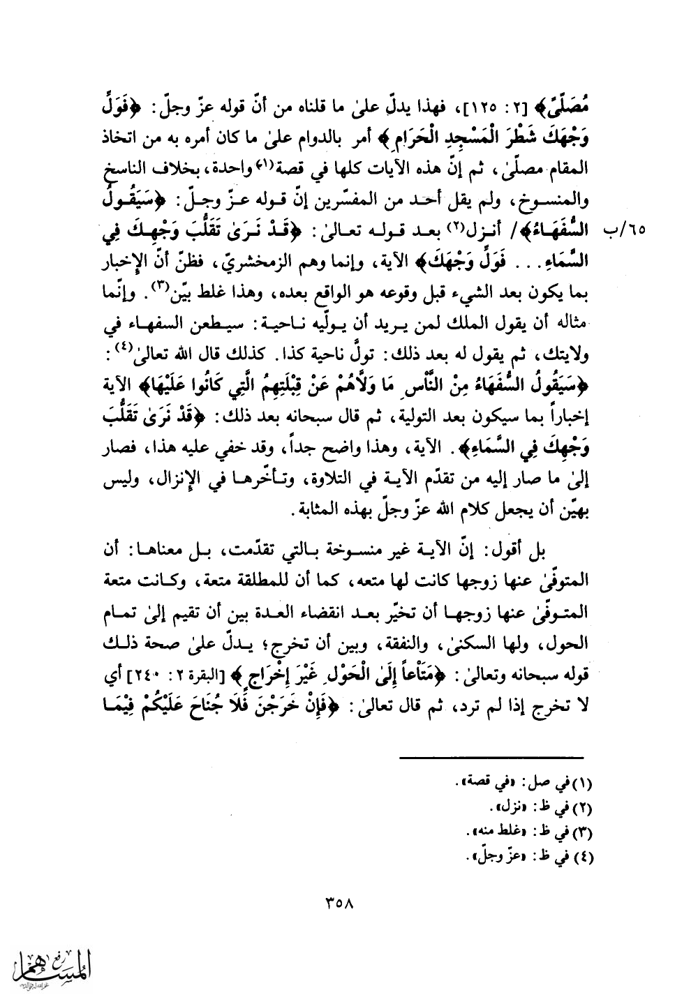 فهذا يدل على ما قلناه من أن قوله عز وجل: (فَوَلِّ وَجْهَكَ شَطْرَ الْمَسْجِدِ الْحَرَامِ) أمر بالدوام على ما كان أمره به من اتخاذ المقام مصلى، ثم إن هذه الآيَات كلها في قصة واحدة، بخلاف الناسخ