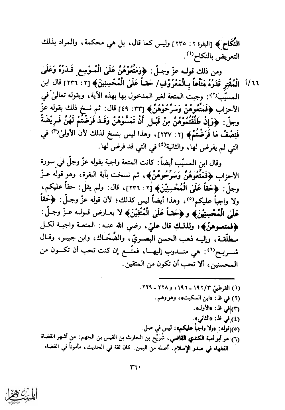قال: ولم يقل: حقاً عليكم، ولا واجباً عليكم، وهذا أيضاً ليس كذلك؛ لأن قوله عز وجل: (حَقًّا عَلَى الْمُحْسِنِينَ) و (حَقًّا عَلَى المُتقِينَ) لا يعارض قوله عز وجل: (فَمَتِّعُوهُنَّ) ؟ ولذلك قال عليٌّ، رضي الله عنه: المتعة واجبة لكل مطلقة، وإليه ذهب الحسن البصري، والضخاك، وابن جبير، وقال