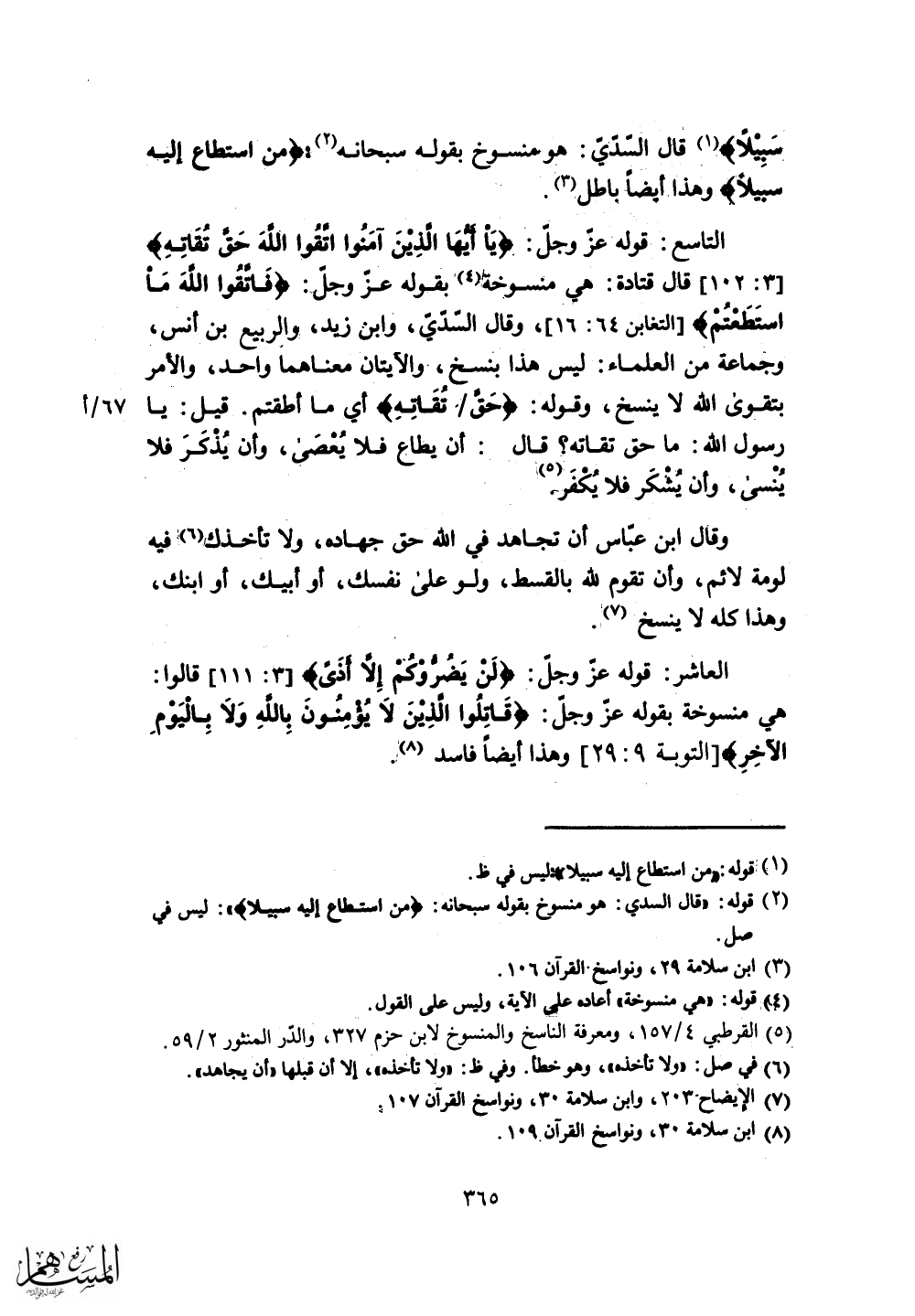 سَبِيْلا، قال السدي: هو منسوخ بقوله سبحانه (مَنِ اسْتَطَاعَ إِلَيْهِ سَبِيلًا) وهذا أيضاً باطل.