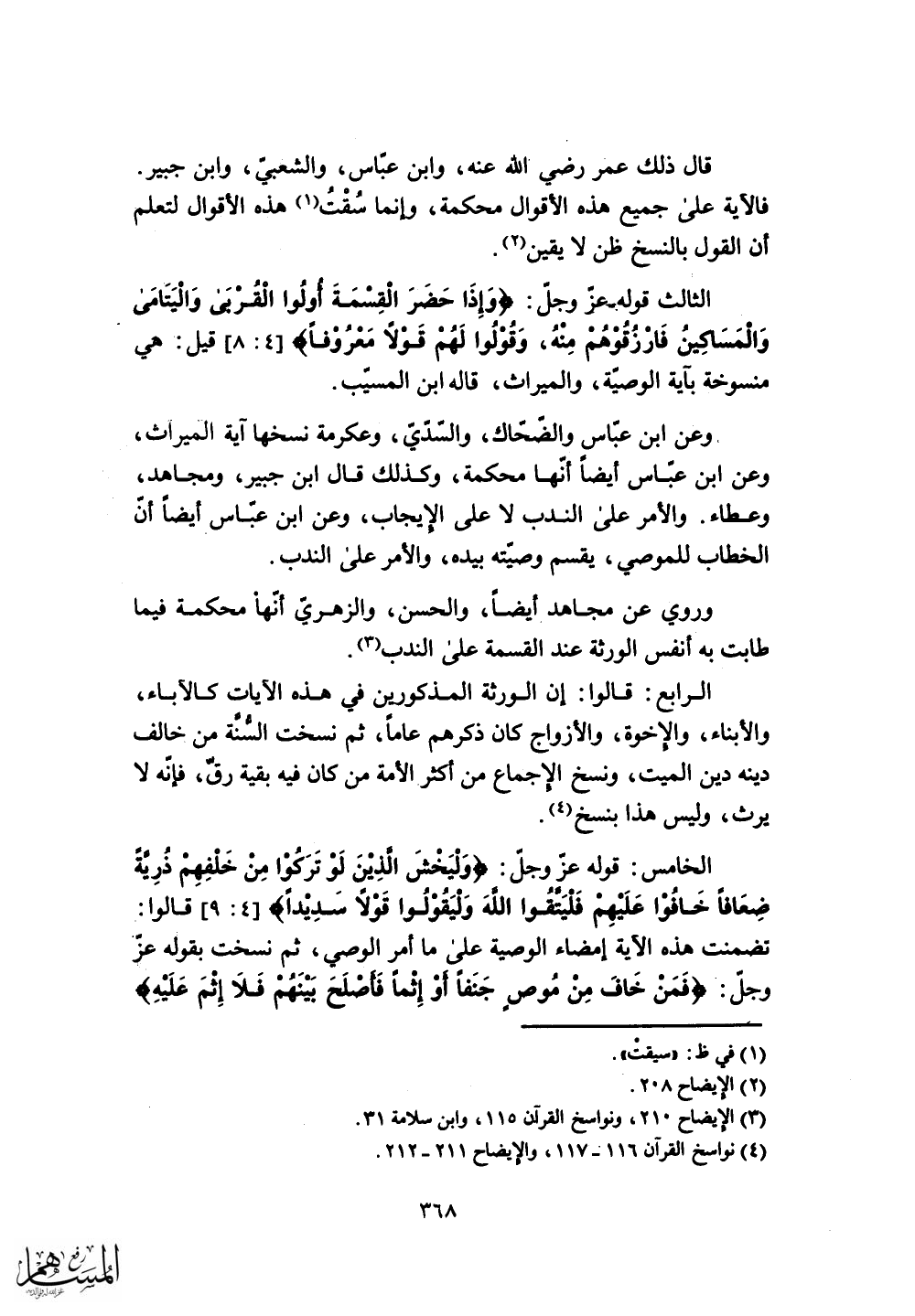 والأبناء، والإخوة، والأزواج كان ذكرهم عاماً، ثم نسخت السنة من خالف دينه دين الميت، ونسخ الإجماع من أكثر - الأمة من كان فيه بقية رقٍّ، فإنه لا يرث، وليس هذا بنسخ.