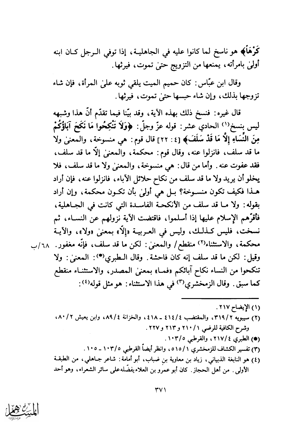 بل هي أولى بأن تكون محكمة، وإن أراد بقوله: ولا ما قد سلف من الأنكحة الفاسدة التي كانت في الجاهلية، فأقرَّهم الإسلام عليها إذا أسلموا، فاقتضت الآية نزولهم عن النساء، ثم نسخت، فليس كذلك، وليس في العربية (إِلَّا) بمعنى "ولا"، والآية محكمة، والاستثناء منقطع.