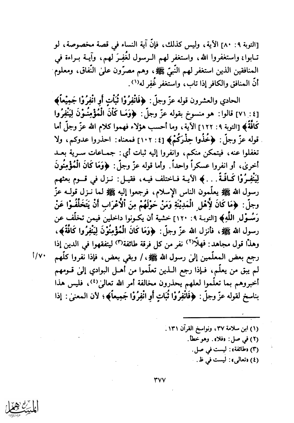 قالوا: هو منسوخ بقوله عز وجل: (وَمَا كَانَ الْمُؤْمِنُونَ لِيَنْفِرُوا كَافَّةً)