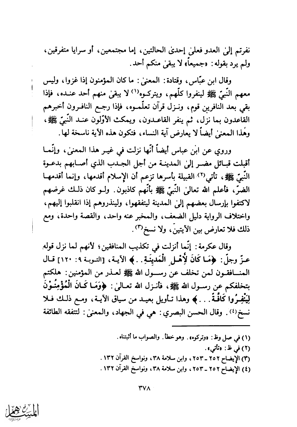 قال المنافقون لمن تخلف عن رسول الله - صلى الله عليه وسلم - لعذر من المؤمنين: هلكتمِ بتخلفكم عن رسول الله - صلى الله عليه وسلم -، فأنزل الله تعالى: (وَمَا كَانَ الْمُؤْمِنُونَ لِيَنْفِرُوا كَافَّةً)