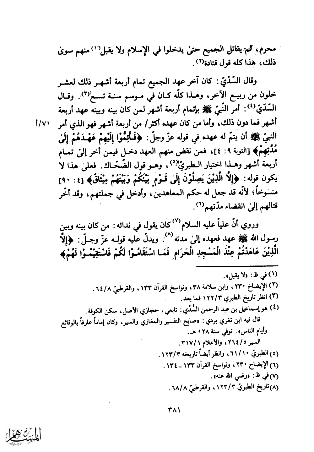 ويدل عليه قوله عزَّ وجلَّ: (إِلَّا الَّذِينَ عَاهَدْتُمْ عِنْدَ الْمَسْجِدِ الْحَرَامِ فَمَا اسْتَقَامُوا لَكُمْ فَاسْتَقِيمُوا لَهُمْ) .