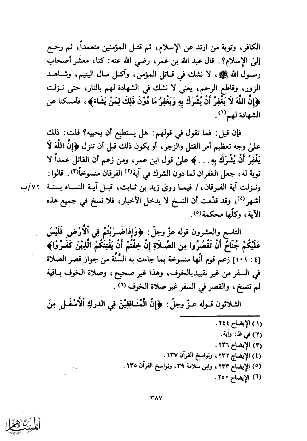 زعم قوم أنها منسوخة بما جاءت به السنة من جواز قصر الصلاة