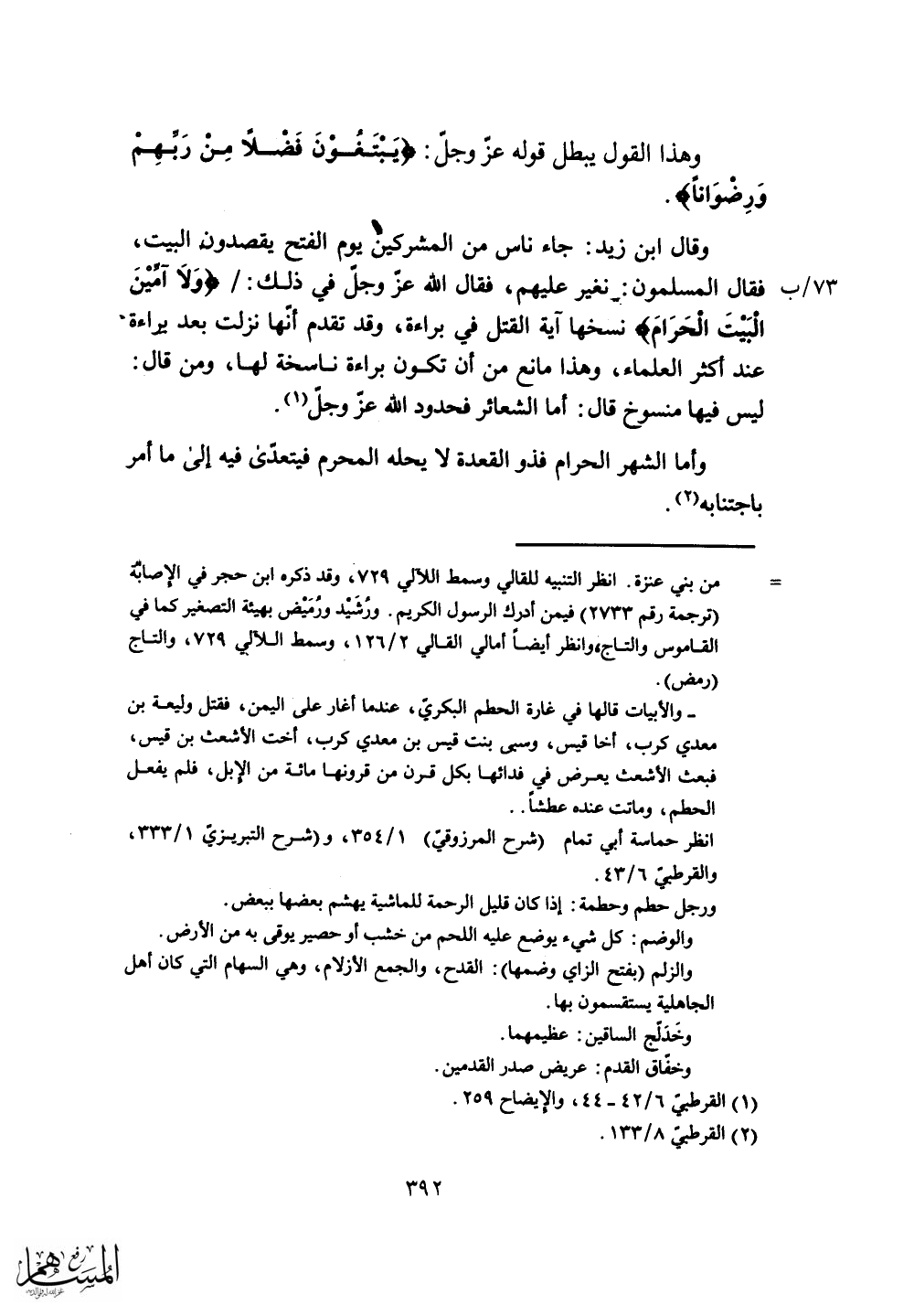 وقد تقدم أنها نزلت بعد براءة عند أكثر العلماء، وهذا مانع من أن تكون براءة ناسخة لها، ومن قال: ليس فيها منسوخ قال: أما الشعائر فحدود الله عز وجل.