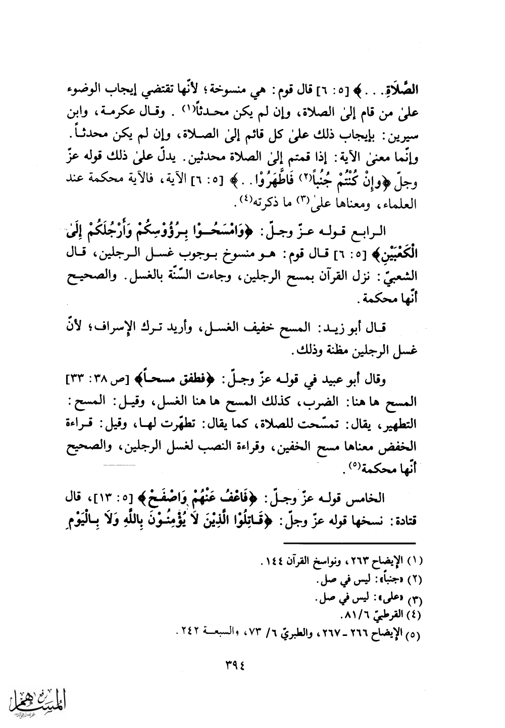 الرابع قوله عز وجل: (وَامْسَحُوا بِرُءُوسِكُمْ وَأَرْجُلَكُمْ إِلَى الْكَعْبَيْنِ)