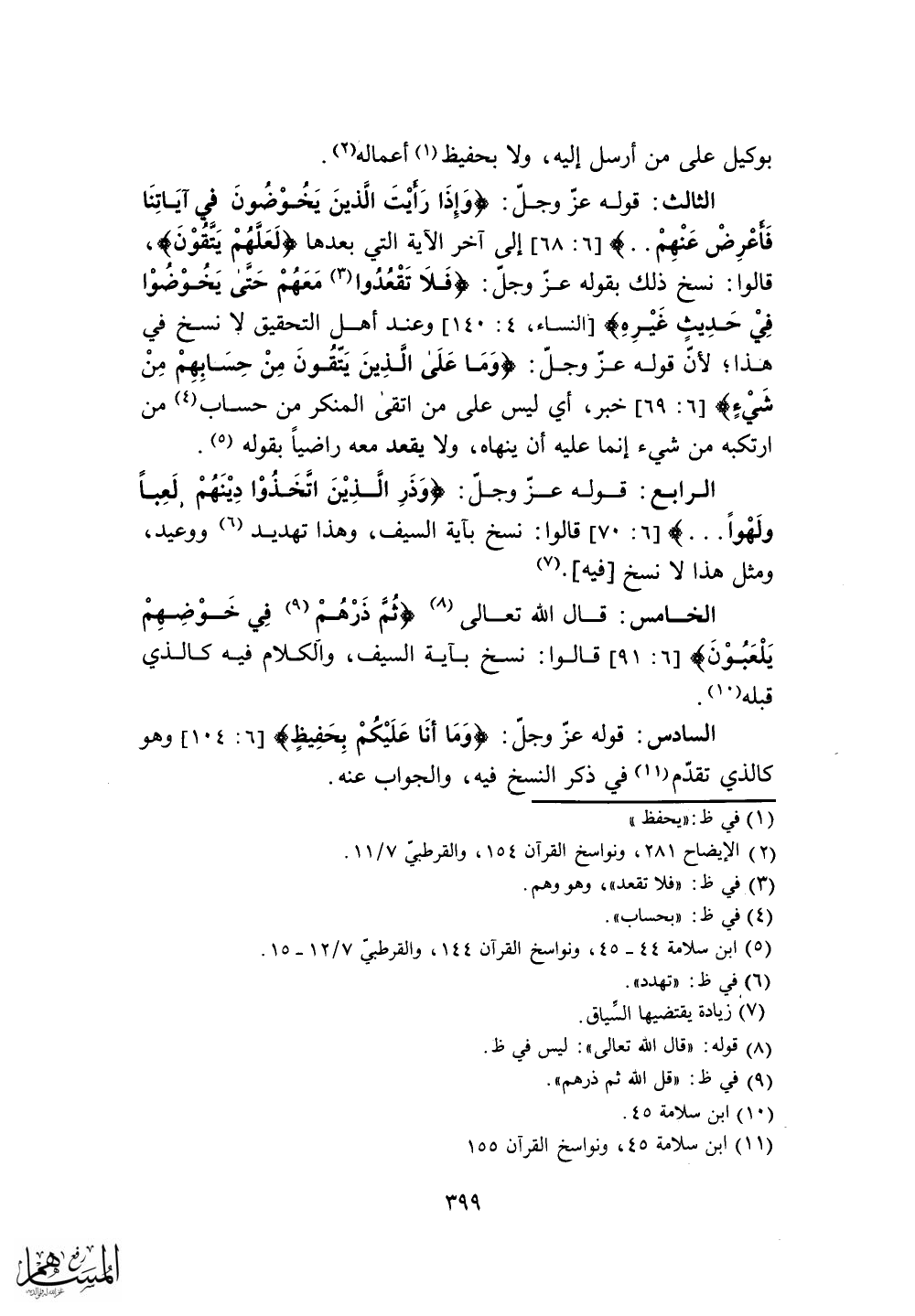 الثالث: قوله عز وجل: (وَإِذَا رَأَيْتَ الَّذِينَ يَخُوضُونَ فِي آيَاتِنَا فَأَعْرِضْ عَنْهُمْ) إلى آخر الآية التي بعدها (لَعَلهُمْ يَتقُوْنَ) .