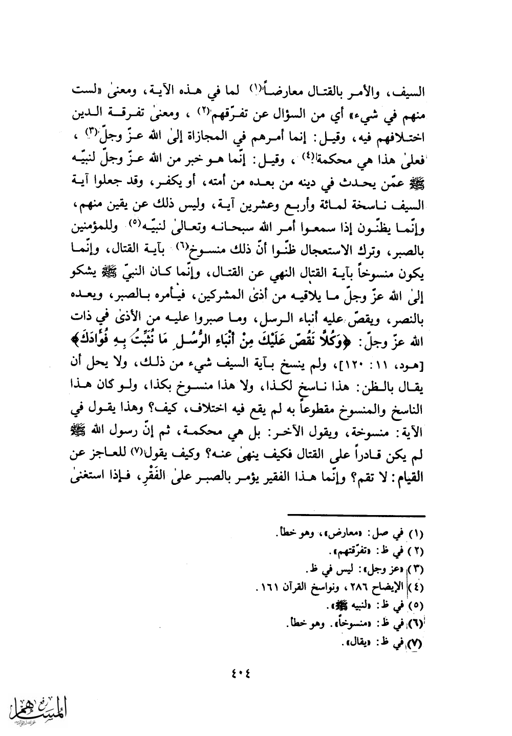 يكون منسوخاً بآية القتال النهي عن القتال، وإنّما كان النبي - صلى الله عليه وسلم - يشكو إلى الله عز وجل ما يلاقيه من أذى المشركين، فيأمره بالصبر، ويعده بالنصر، ويقص عليه أنباء الرسل، وما صبروا عليه من الأذى في ذات الله عز وجل: (وَكُلًّا نَقُصُّ عَلَيْكَ مِنْ أَنْبَاءِ الرُّسُلِ مَا نُثَبِّتُ بِهِ فُؤَادَكَ)