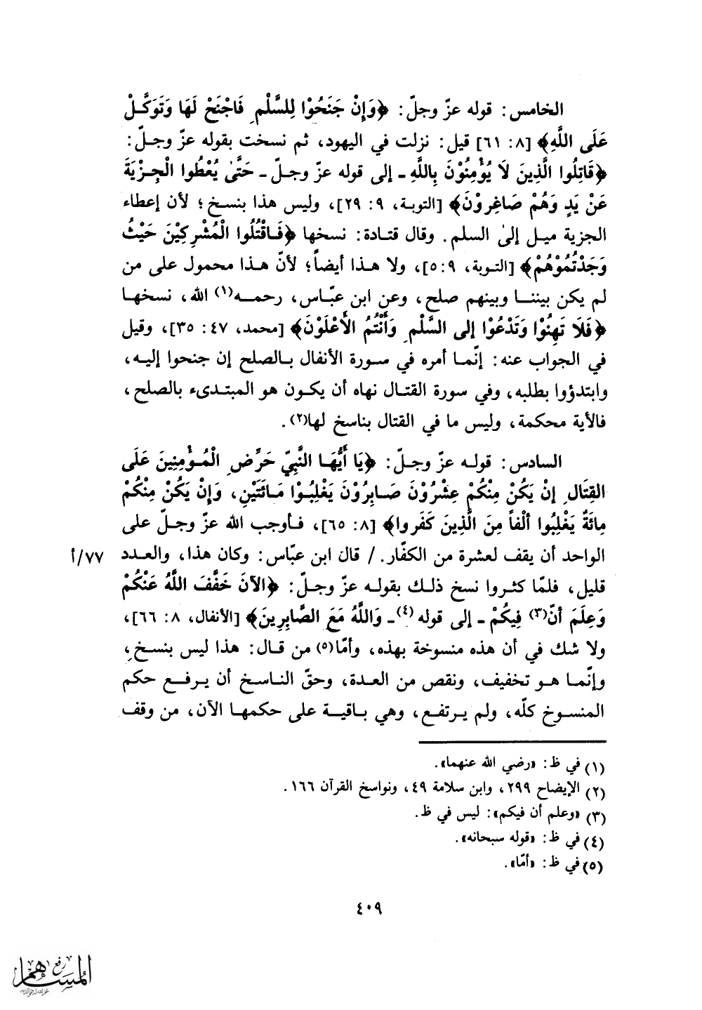 وعن ابن عباس، رحمه الله، نسخها (فَلَا تَهِنُوا وَتَدْعُوا إِلَى السَّلْمِ وَأَنْتُمُ الْأَعْلَوْنَ) .