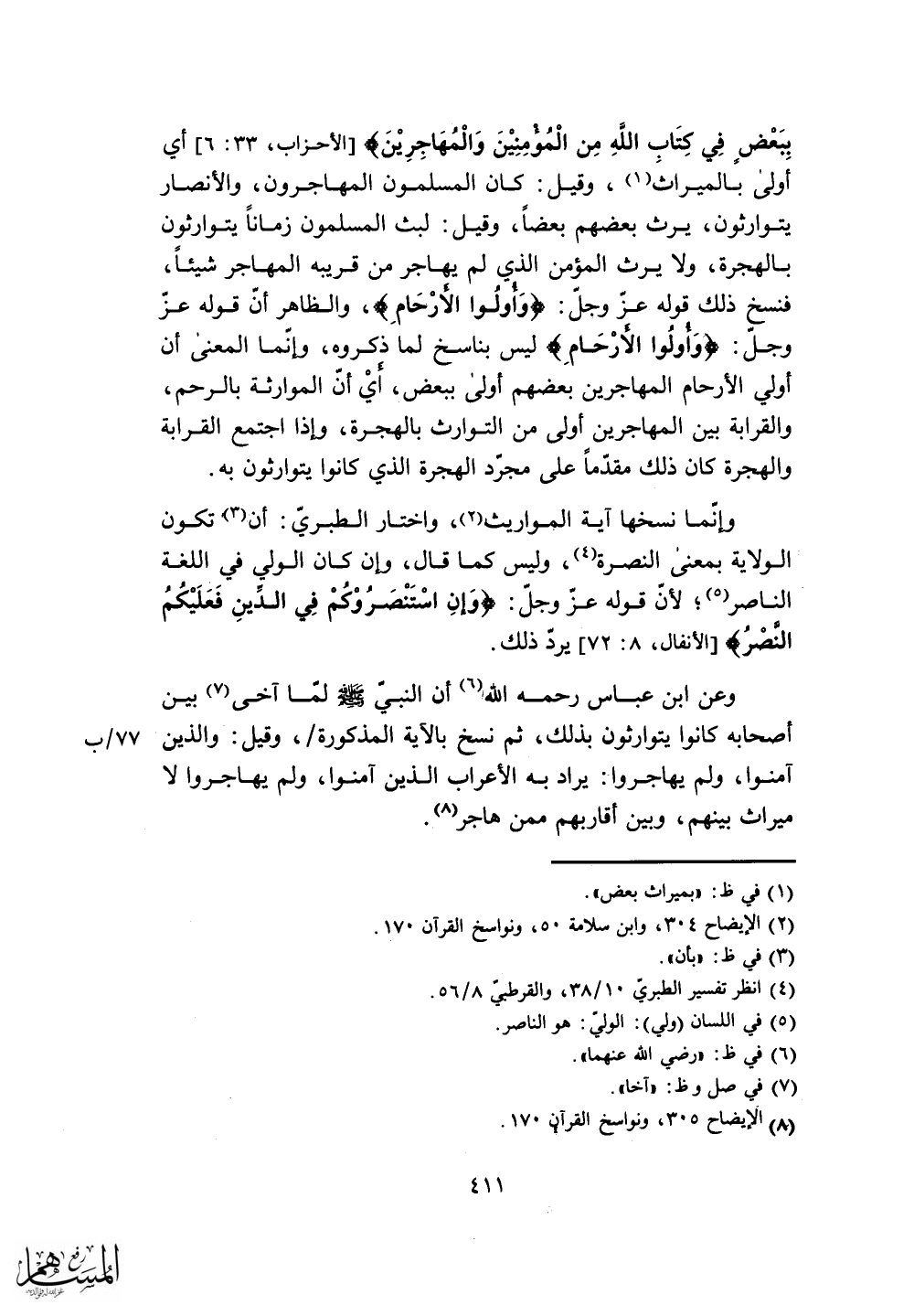فنسخ ذلك قوله عز وجل: (وَأولُو الأرْحَامِ) ، والظاهر أن قوله عزّ
