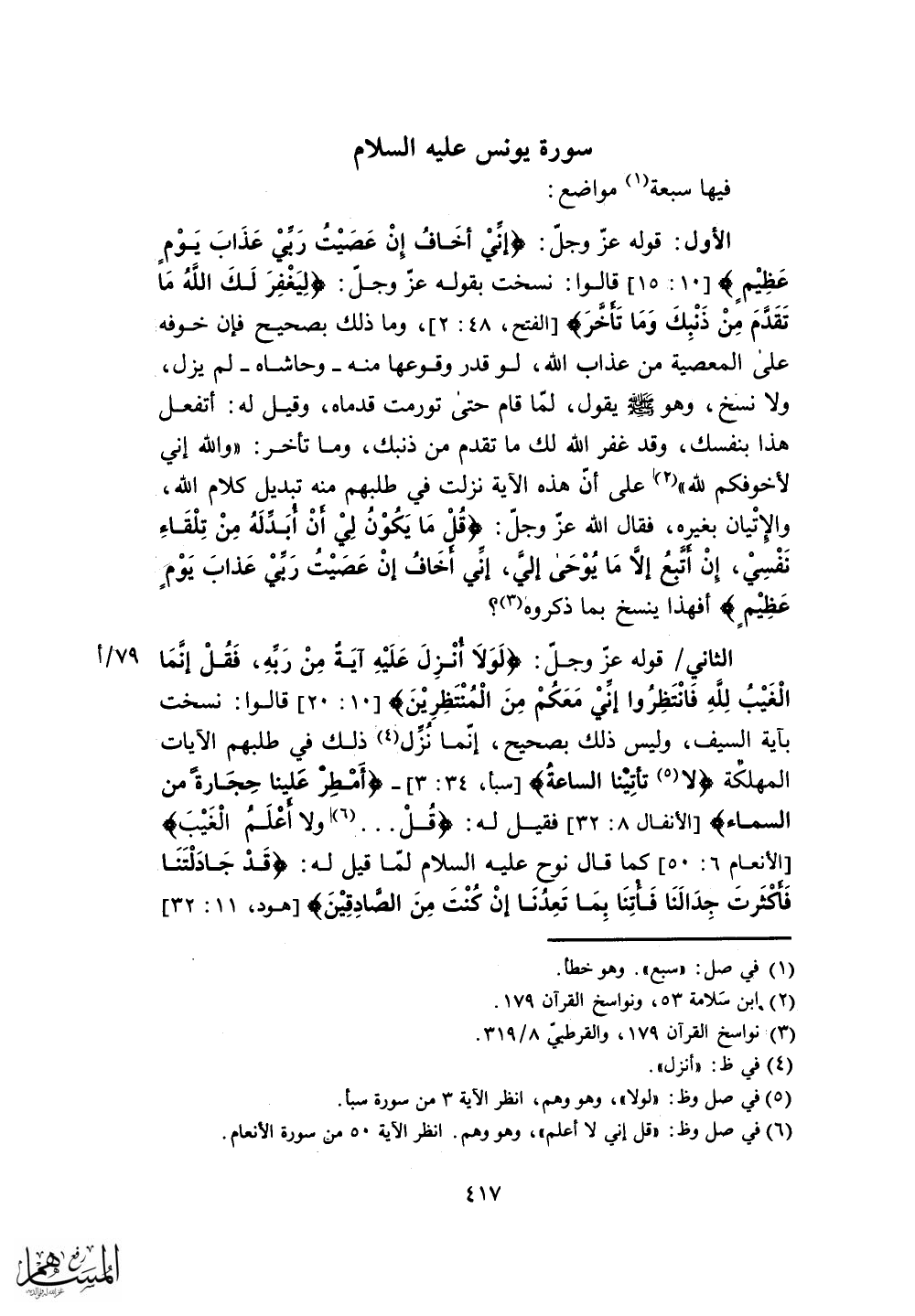 قالوا: نسخت بآية السيف، وليس ذلك بصحيح، إنّما نُزَل ذلك في طلبهم الآيات المهلكة (لا تأتِيْنا الساعةُ) - (أَمْطِرْ عَلينا حِجَارة من السماء)