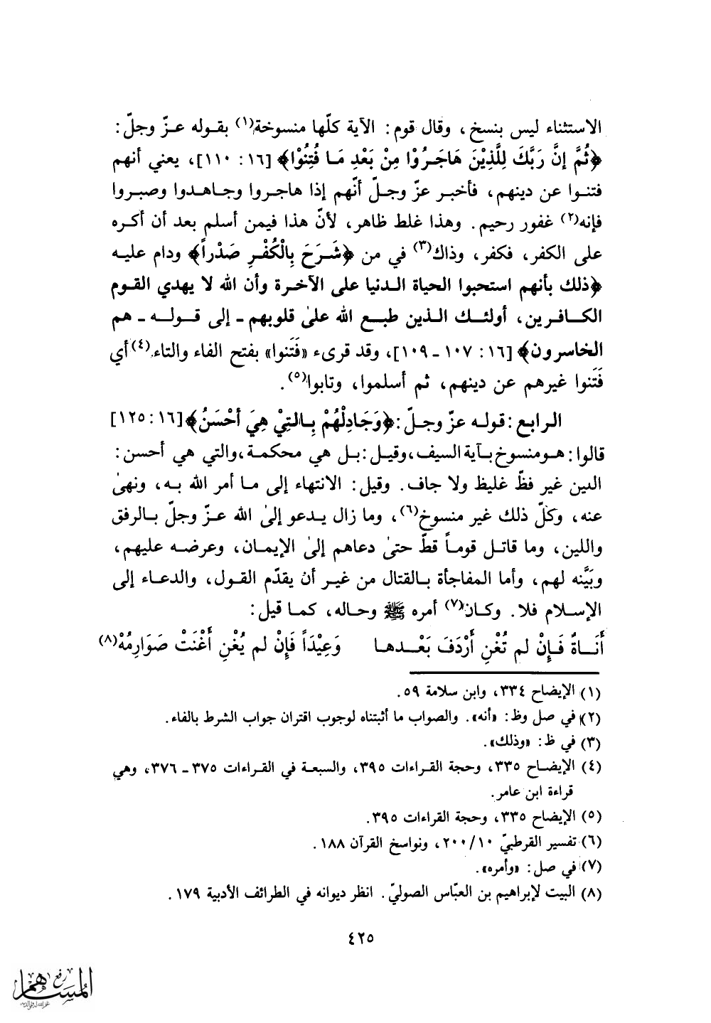وقيل: الانتهاء إلى ما أمر الله به، ونهى عنه، وكل ذلك غير منسوخ، وما زال يدعو إلى الله عز وجل بالرفق واللين، وما قاتل قوماً قط حتى دعاهم إلى الإيمان، وعرضه عليهم، وبَيَّنه لهم، وأما المفاجأة بالقتال من غير أن يقدم القول، والدعاء إلى الإسلام فلا.