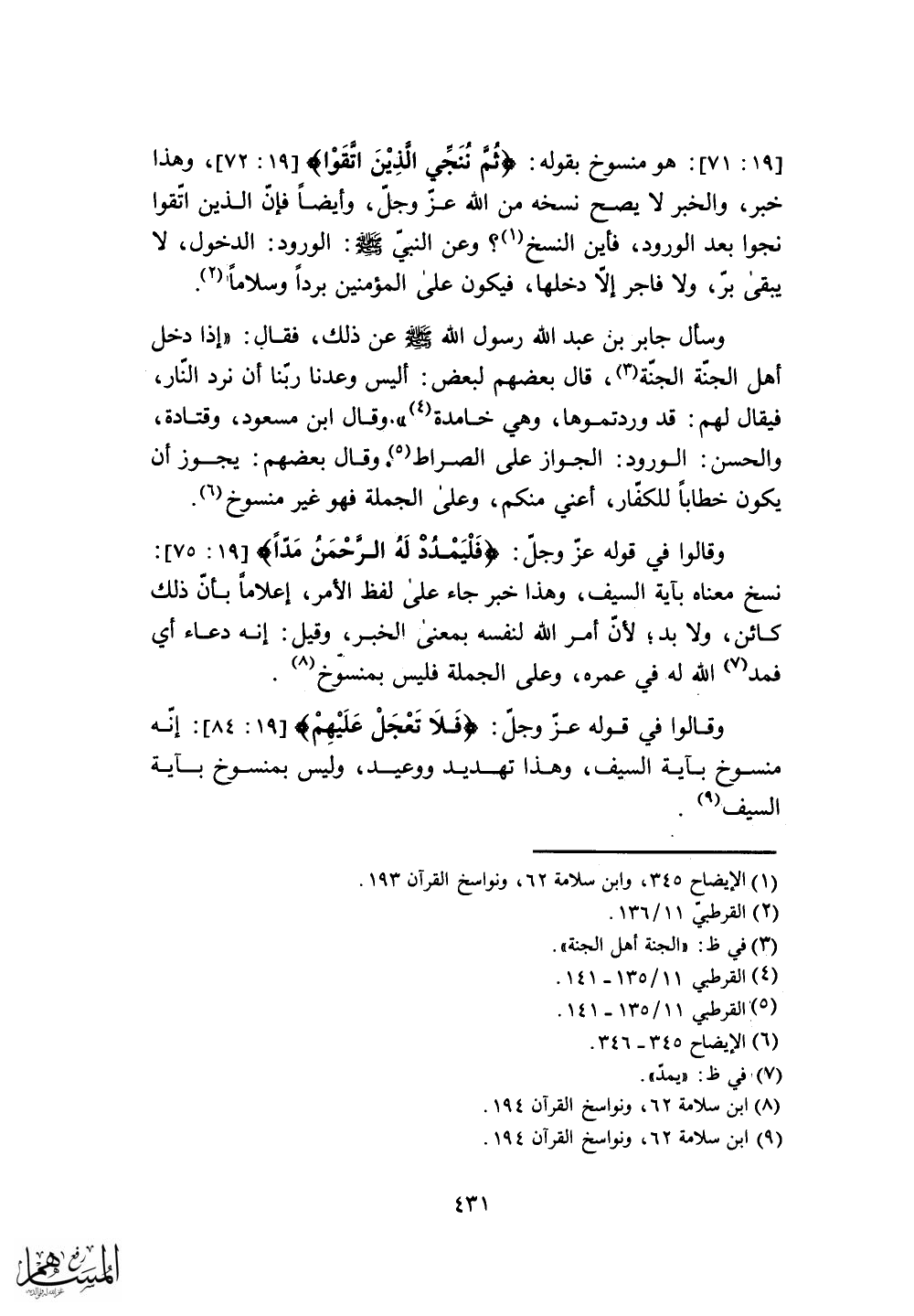 هو منسوخ بقوله: (ثُمَّ نُنَجِّي الَّذِينَ اتَّقَوْا) ، وهذا خبر، والخبر لا يصح نسخه من الله عز وجلّ، وأيضاً فإنّ الذين اتقوا نجوا بعد الورود، فأين النسخ؟