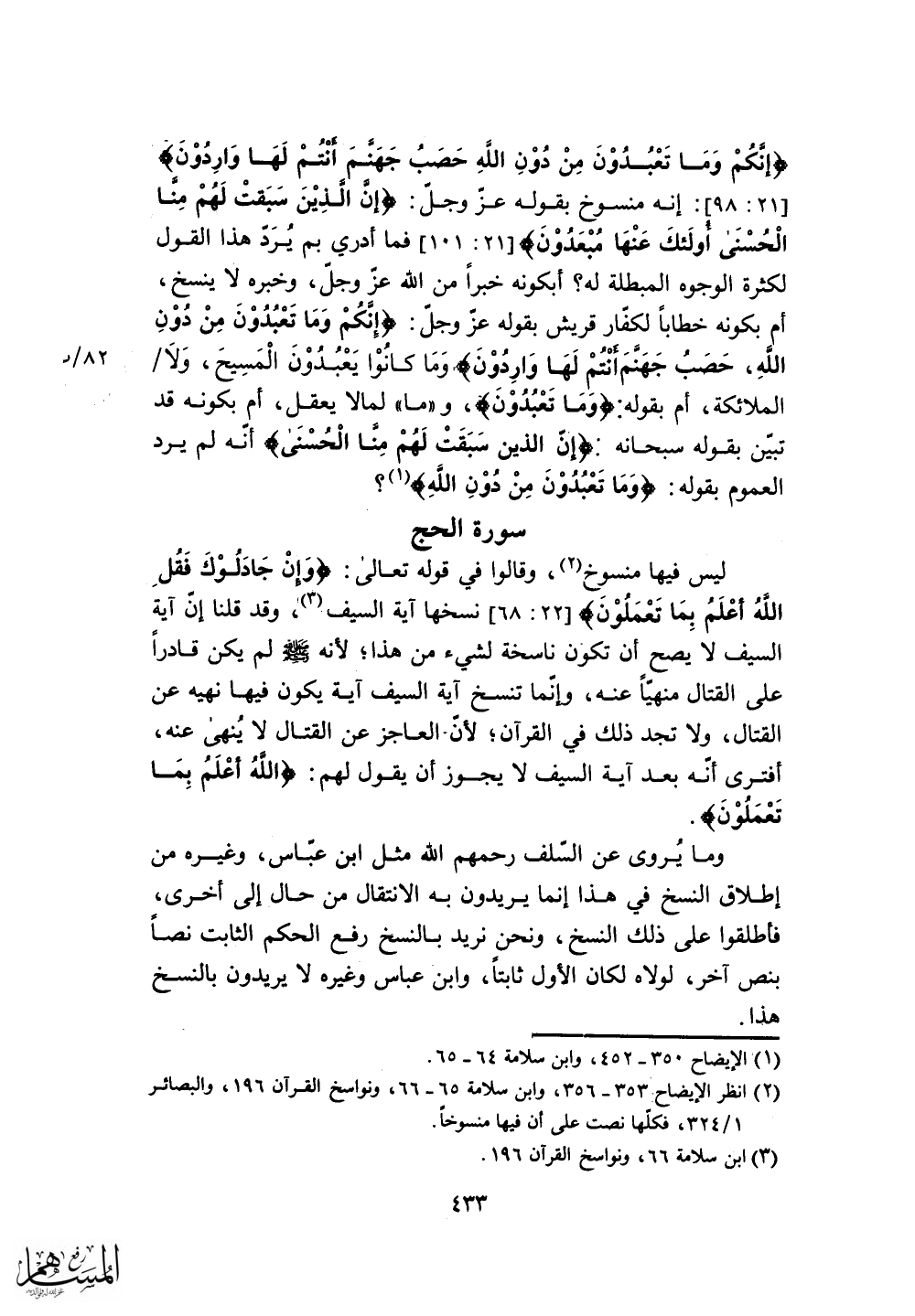 وقد قلنا إن آية السيف لا يصح أن تكون ناسخة لشيء من هذا؛ لأنه - صلى الله عليه وسلم - لم يكن قادراً على القتال منهياً عنه، وإنما تنسخ آية السيف آية يكون فيها نهيه عن القتال، ولا تجد ذلك في القرآن؛ لأن - العاجز عن القتال لا يُنهى عنه.