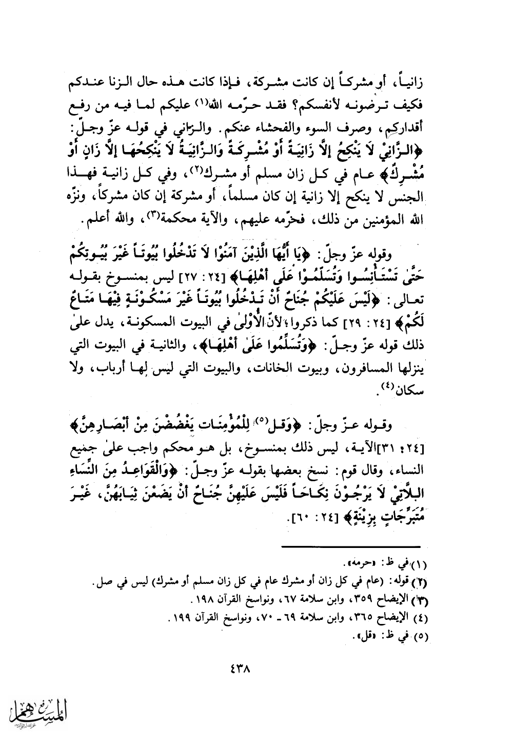 ليس بمنسوخ بقوله تعالى: (لَيْسَ عَلَيْكُمْ جُنَاحٌ أَنْ تَدْخُلُوا بُيُوتًا غَيْرَ مَسْكُونَةٍ فِيهَا مَتَاعٌ لَكُمْ) كما ذكروا؛ لأن الأوْلى في البيوت المسكونة، يدل على