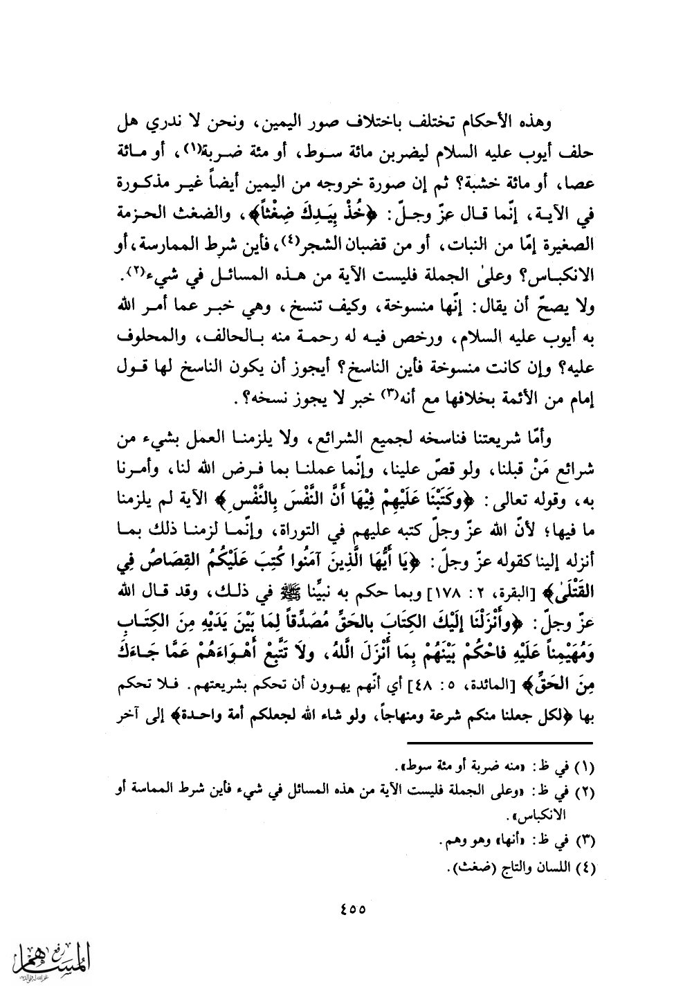 به، وقوله تعالى: (وَكَتَبْنَا عَلَيْهِمْ فِيهَا أَنَّ النَّفْسَ بِالنَّفْسِ) الآية لم يلزمنا