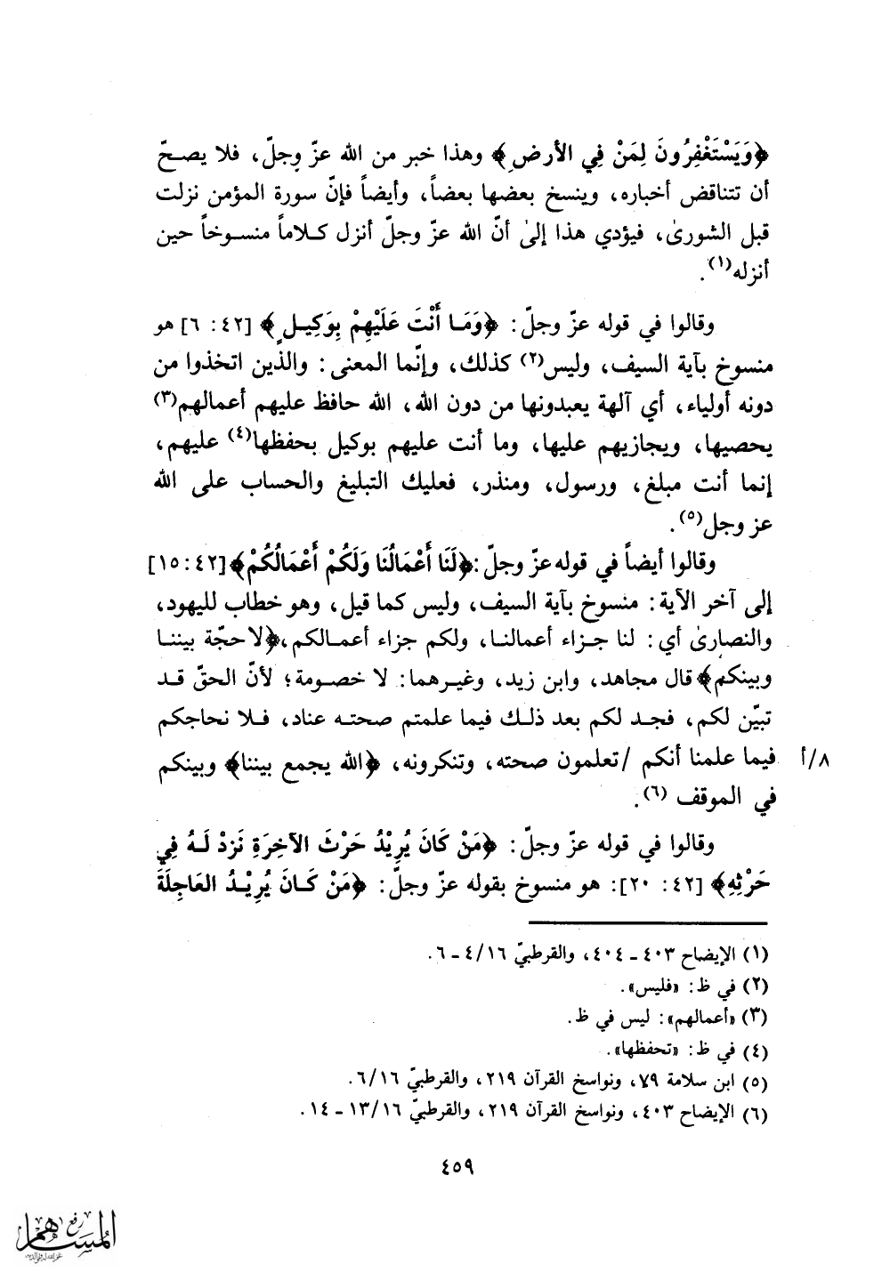 وهذا خبر من الله عز وجل، فلا يصح أن تتناقض أخباره، وينسخ بعضها بعضاً، وأيضاً فإن سورة المؤمن نزلت قبل الشورى، فيؤدي هذا إلى أن الله عز وجل أنزل كلاماً منسوخاً حين أنزله.