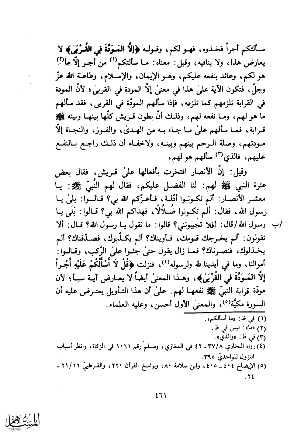 وهذا المعنى أيضاً لا يعارض آية سبأ؛ لأن مودة قرابة النبي - صلى الله عليه وسلم - نفعها لهم.