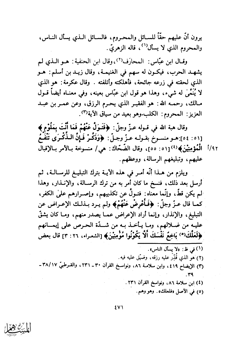 وقال عكرمة: هو الذي لا يُنمَّى له شيء، وهذا هو قول ابن عبَاس بعينه، وفي معناه أيضاً قول مالك، رحمه الله: هو الفقير الذي يحرم الرزق، وعن عمر بن عبد العزيز: المحروم: الكلب.