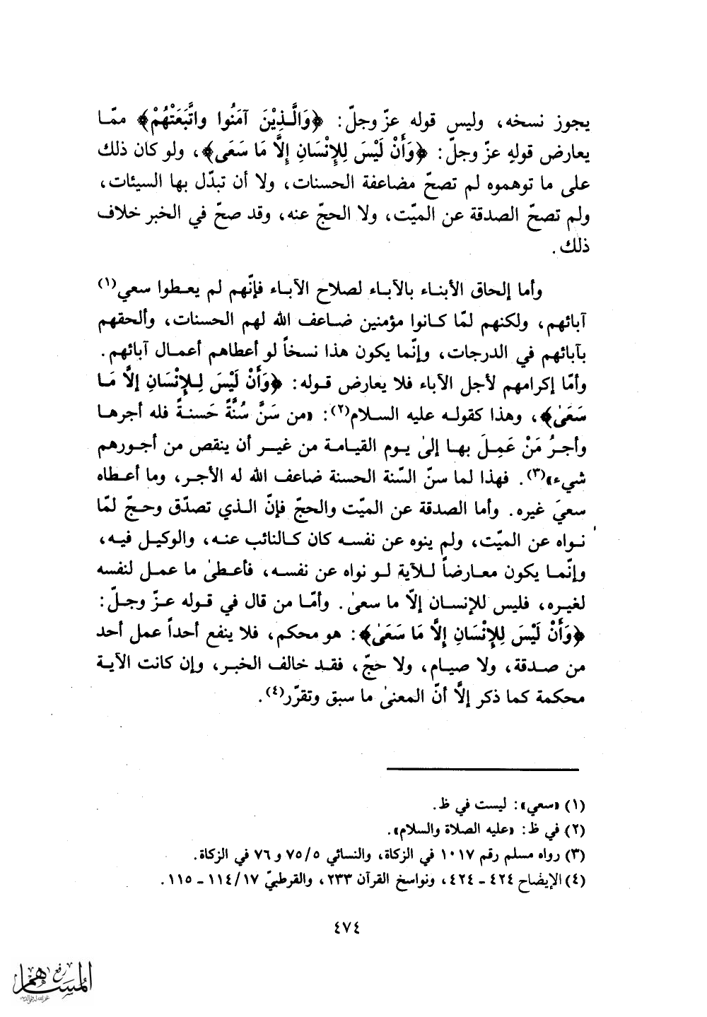 وأما من قال في قوله عزَّ وجلَّ: (وَأَنْ لَيْسَ لِلْإِنْسَانِ إِلَّا مَا سَعَى) : هو محكم، فلا ينفع أحداً عمل أحد من صدقة، ولا صيام، ولا حجّ، فقد خالف الخبر، وإن كانت الآية محكمة كما ذكر إلَّا أن المعنى ما سبق وتقرر.