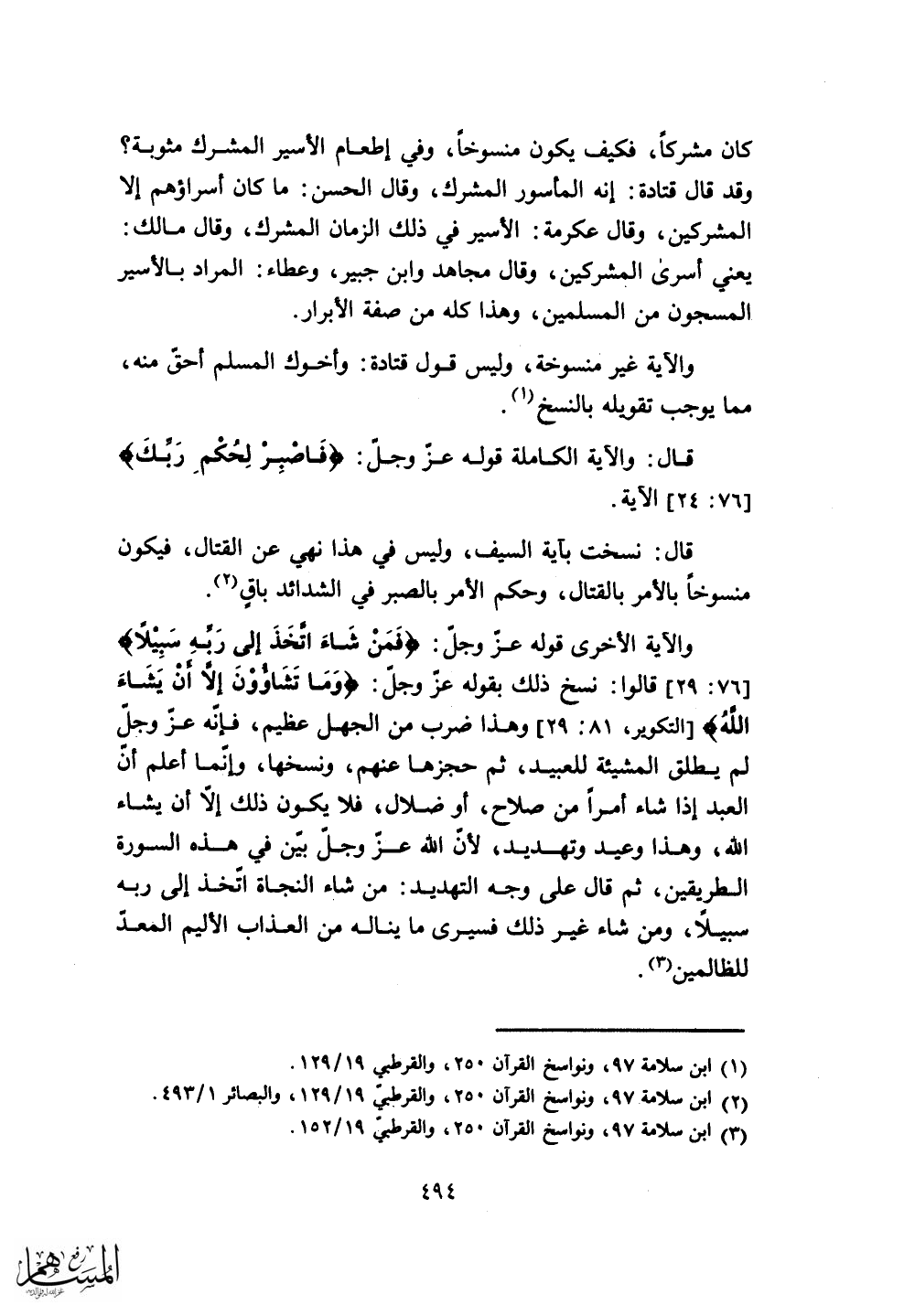 قال: نسخت بآية السيف، وليس في هذا نهي عن القتال، فيكون