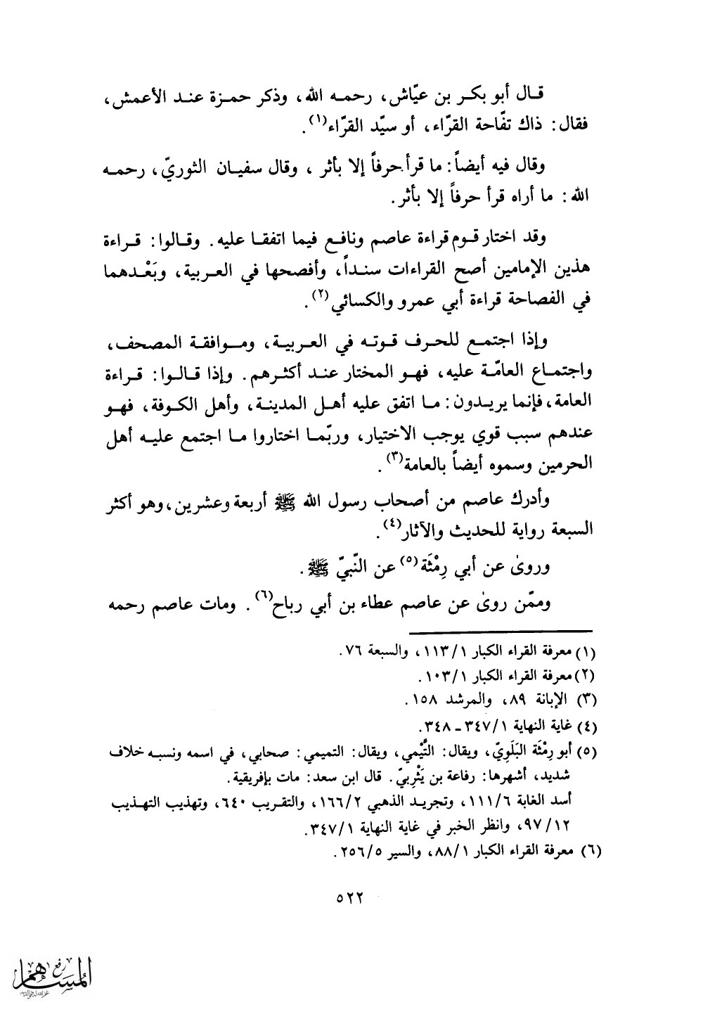 وأدرك عاصم من أصحاب رسول الله - صلى الله عليه وسلم - أربعة وعشرين، وهو أكثر السبعة رواية للحديث والآثار.