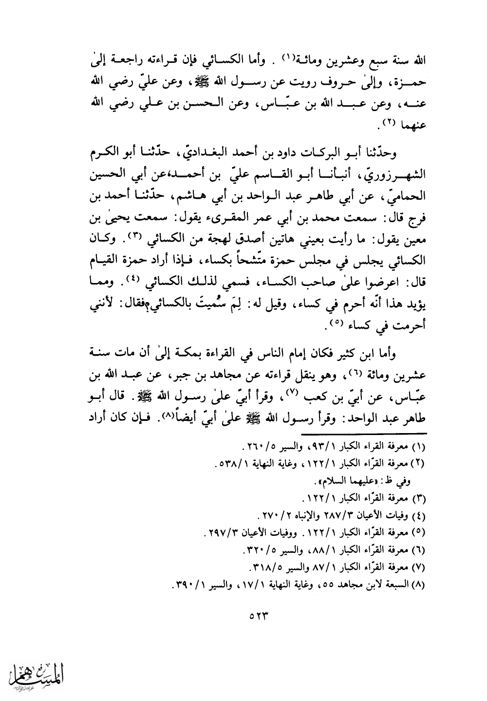 وأما الكسائي فإن قراءته راجعة إلى حمزة، وإلى حروف رويت عن رسول الله - صلى الله عليه وسلم - وعن علي رضي الله عنه، وعن عبد الله بن عباس، وعن الحسن بن علي رضي الله عنهما.