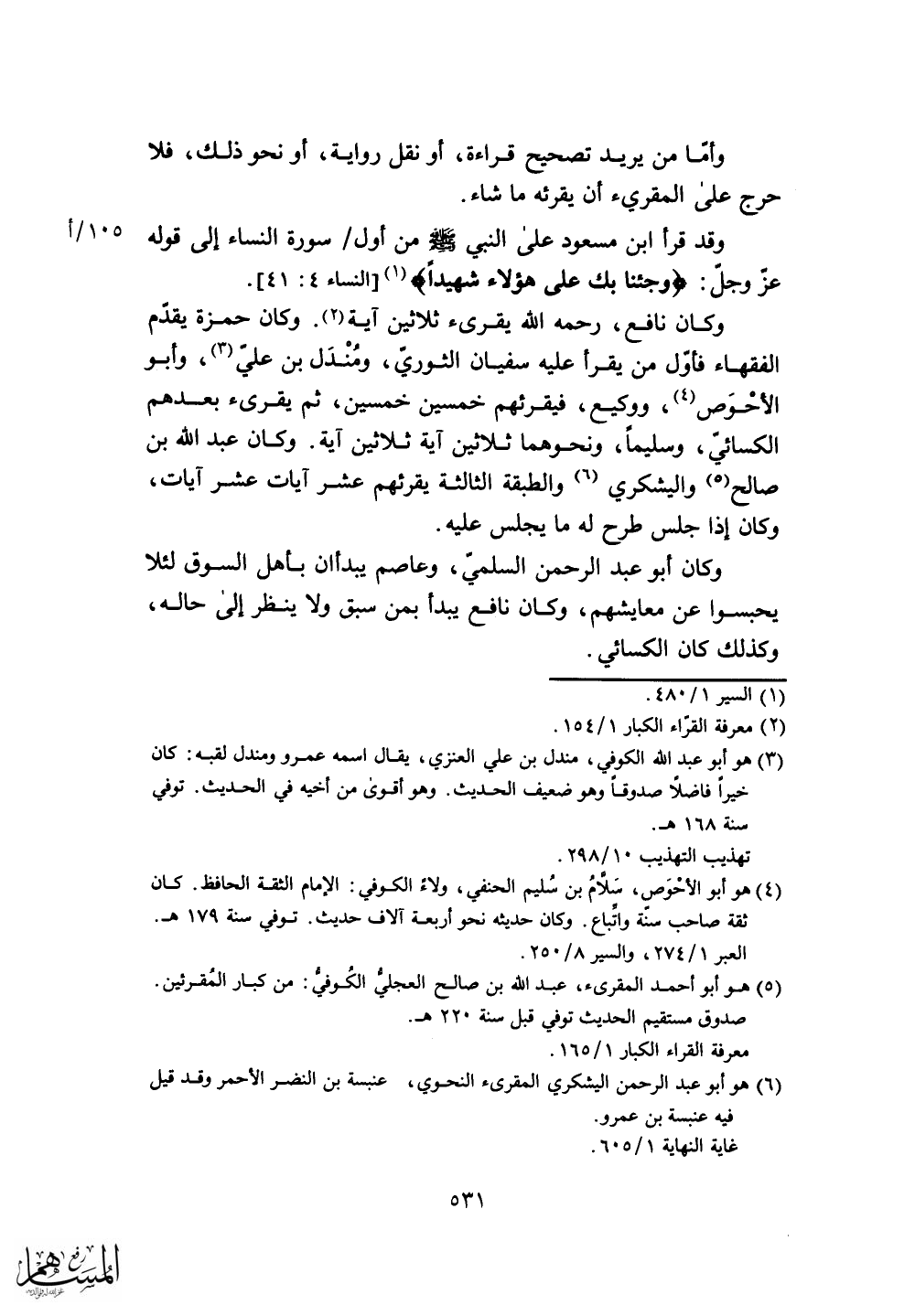 وكان حمزة يقدم الفقهاء فأول من يقرأ عليه سفيان الثوري، ومُنْدَل بن على، وأبو الأحْوَص، ووكيع، فيقرئهم خمسين خمسين، ثم يقرئ بعدهم