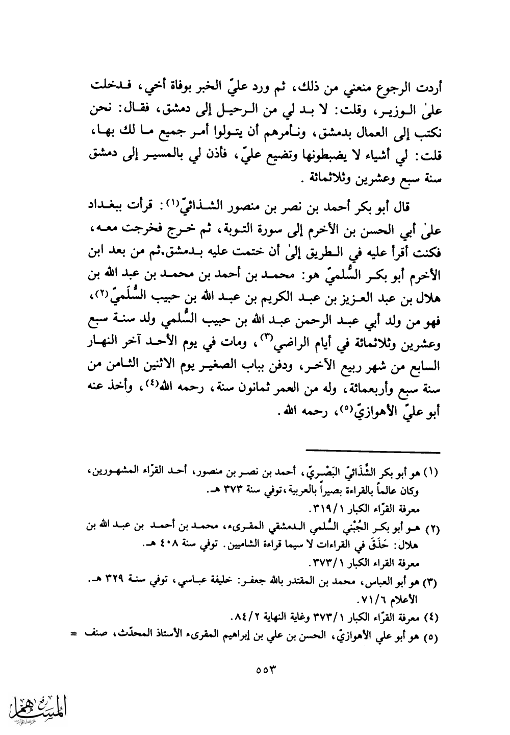 قال أبو بكر أحمد بن نصر بن منصور الشذائي: قرأت ببغداد