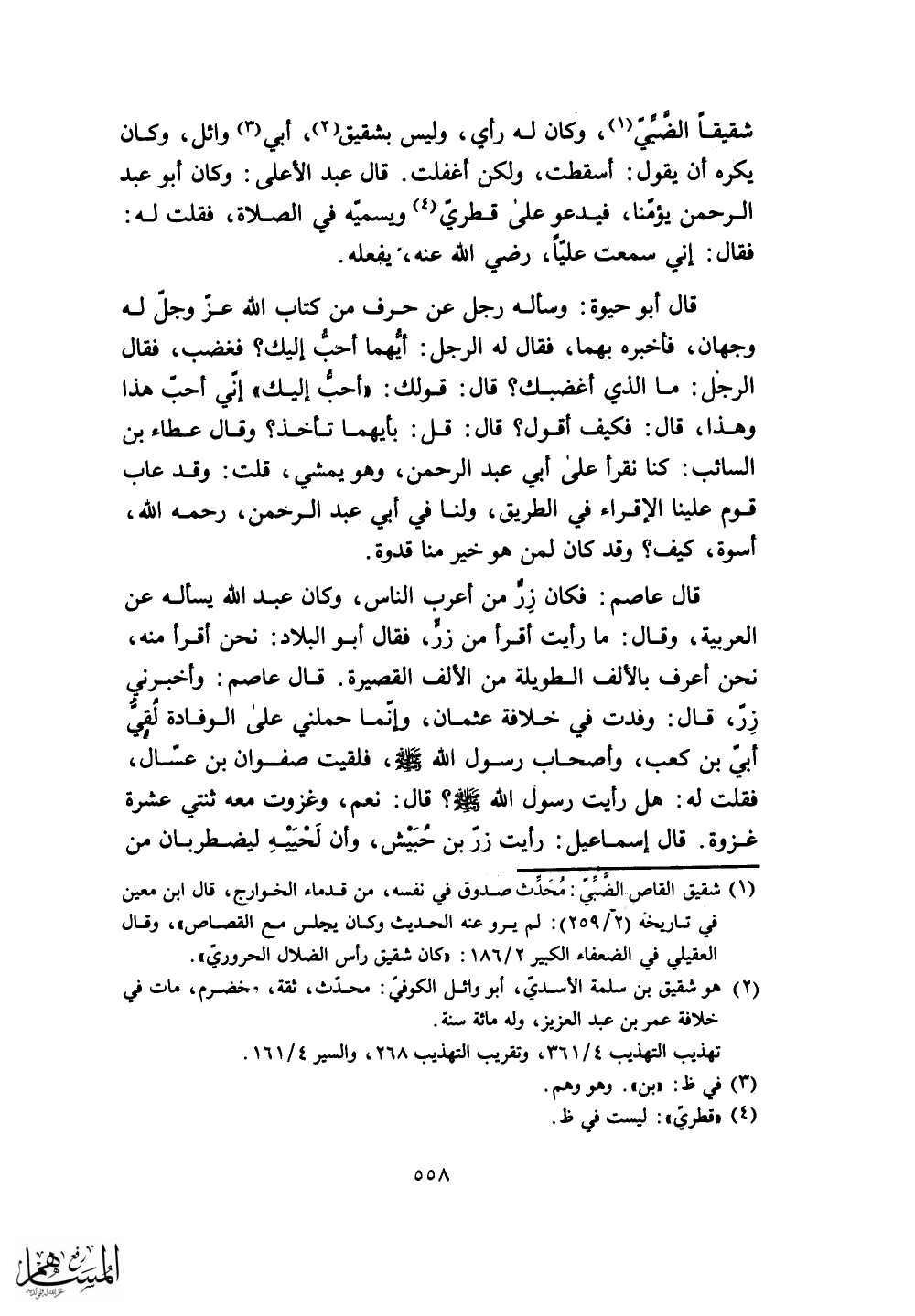قال عاصم: فكان زِر من أعرب الناس، وكان عبد الله يسأله عن