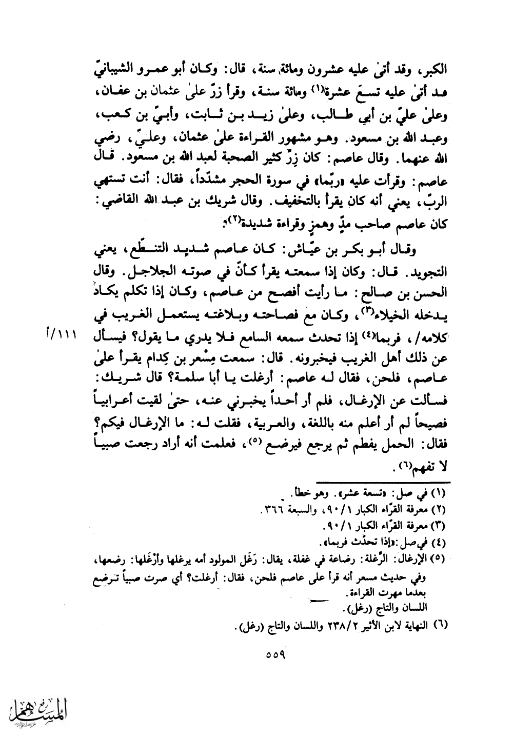قال: سمعت مِسْعر بن كِدام يقرأ على عاصم، فلحن، فقال له عاصم: أرغلت يا أبا سلمة؟