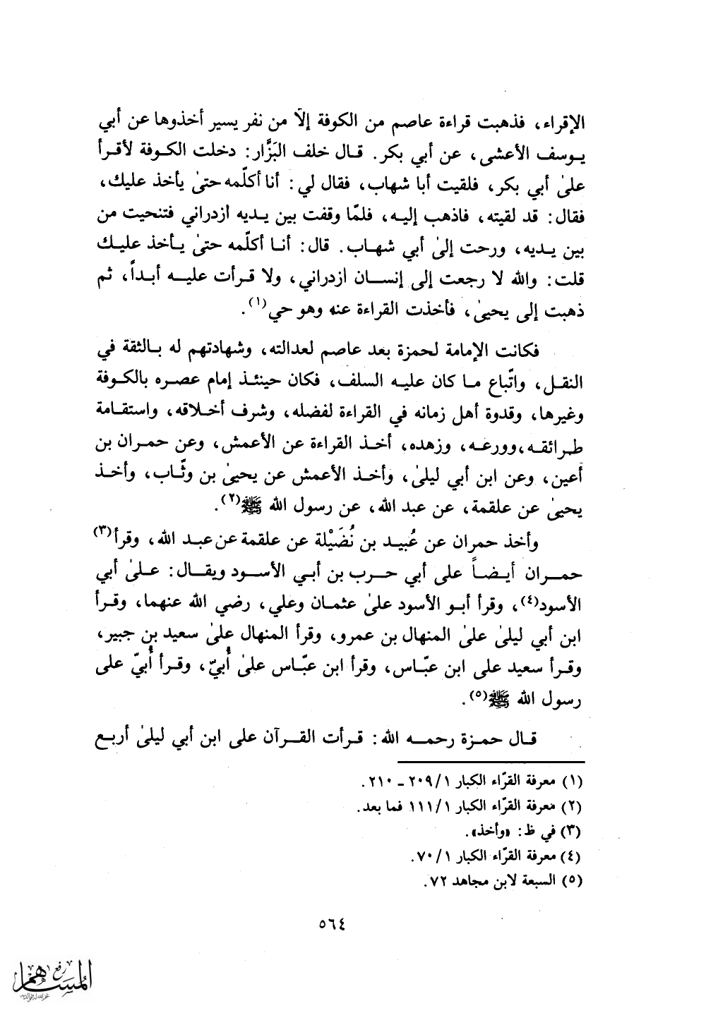 فكانت الإمامة لحمزة بعد عاصم لعدالته، وشهادتهم له بالثقة في
