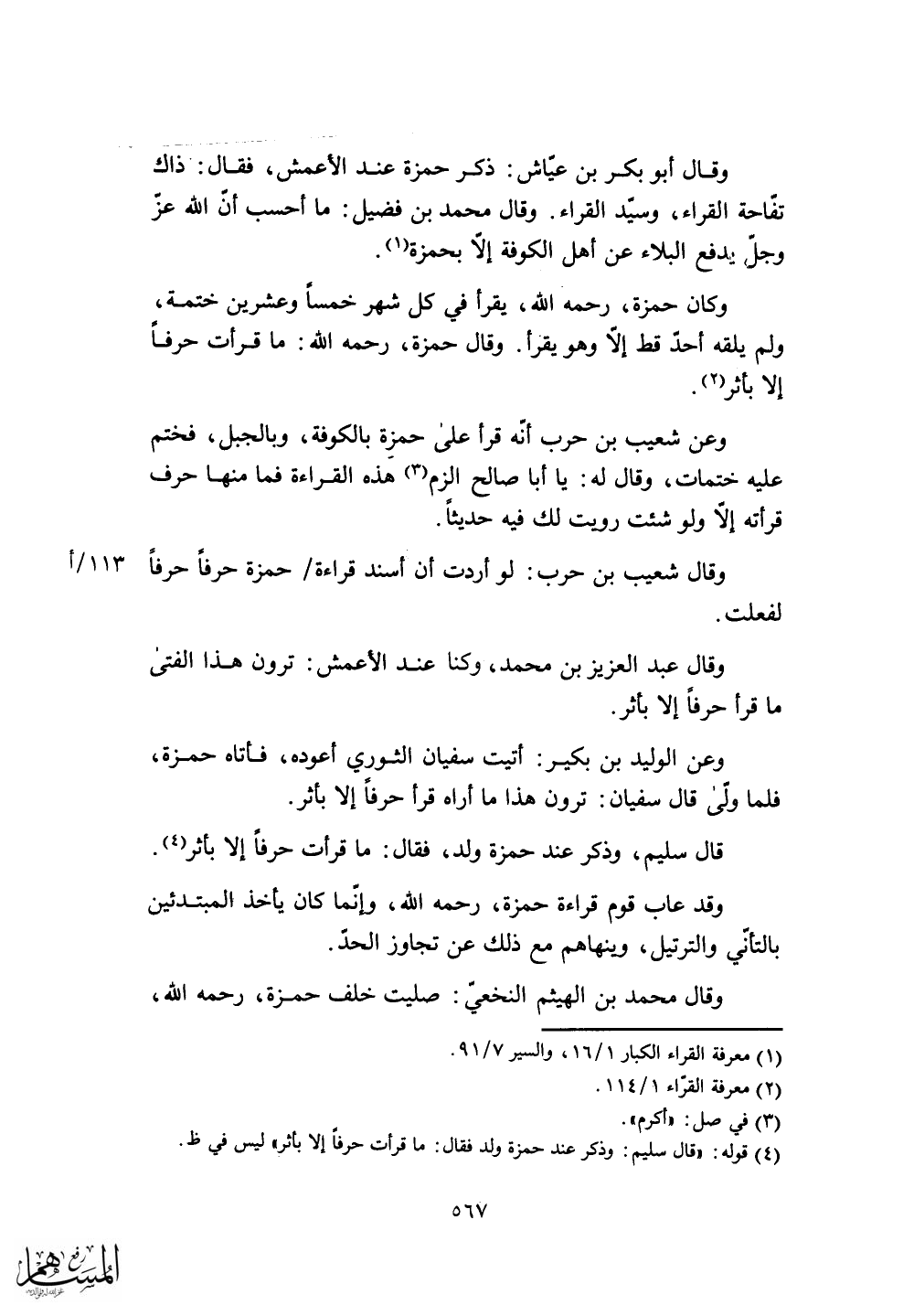 وقال حمزة، رحمه الله: ما قرأت حرفاً إلا بأثر.