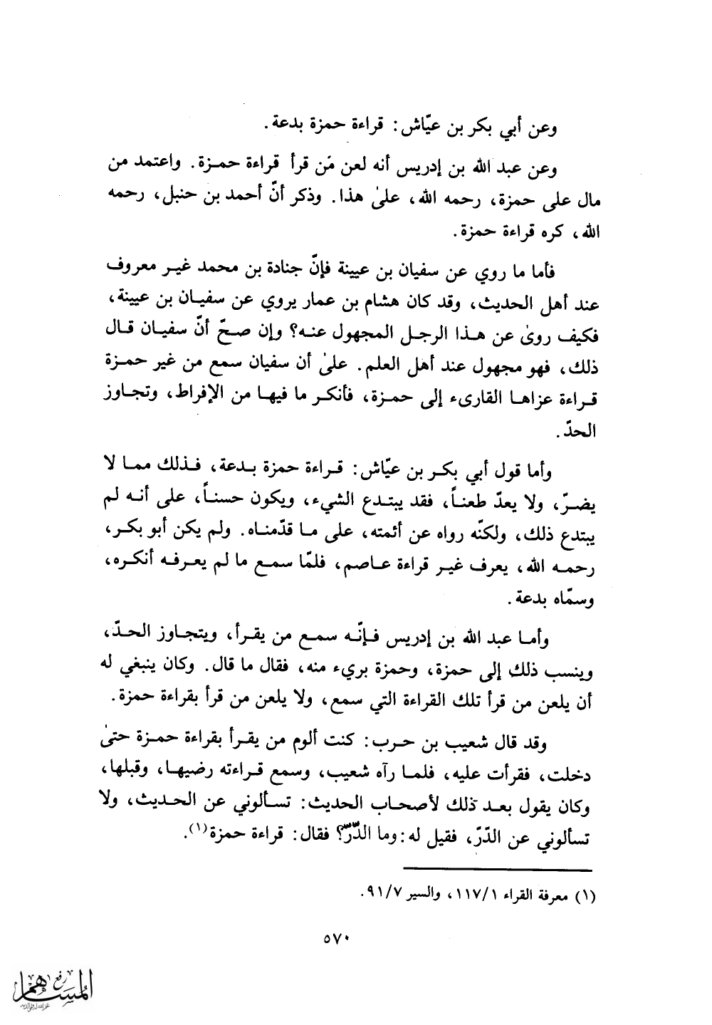 وعن عبد الله بن إدريس أنه لعن من قرأ قراءة حمزة.