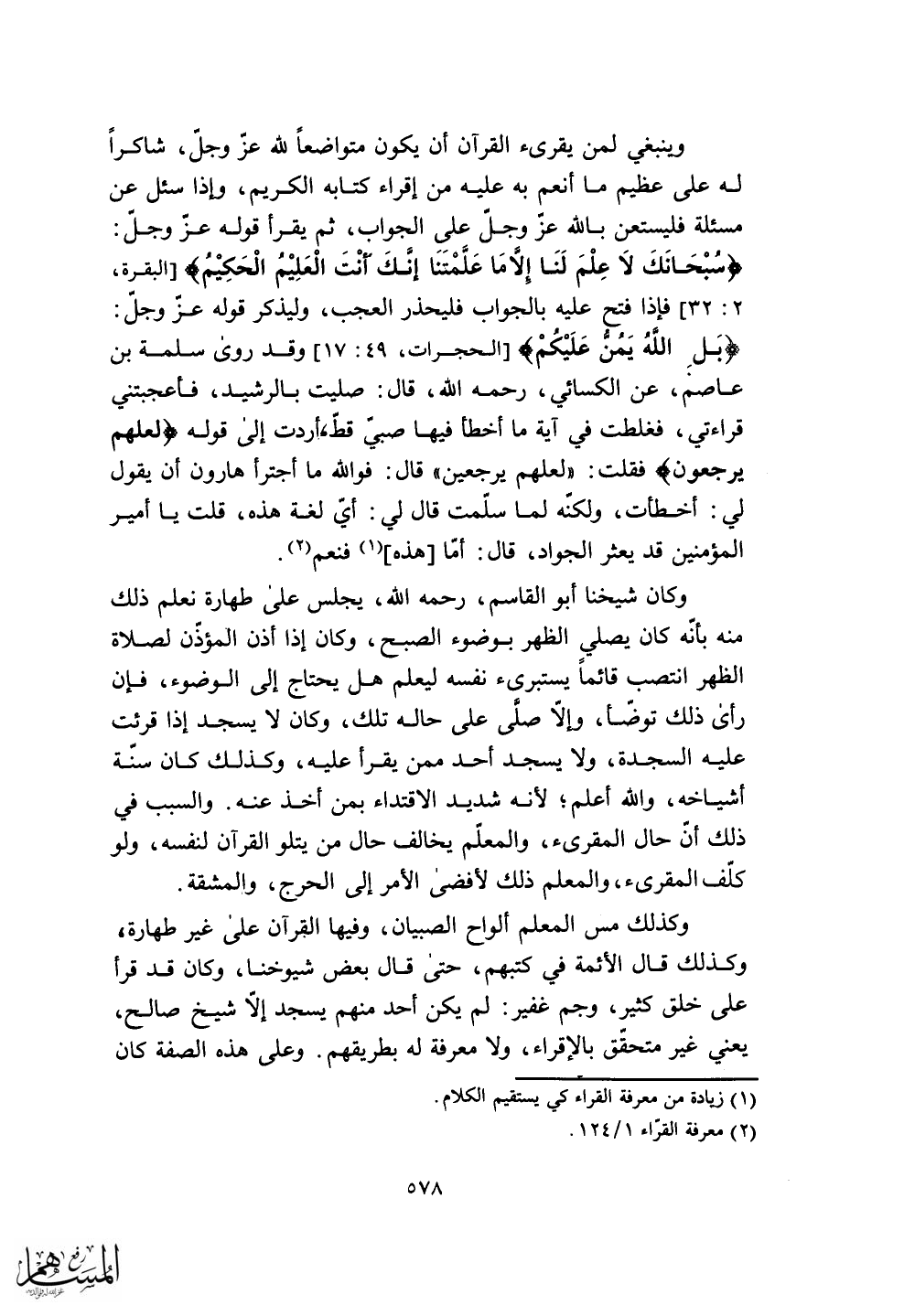 وقد روى سلمة بن عاصم، عن الكسائي، رحمه الله، قال: صليت بالرشيد، فأعجبتني قراءتي، فغلطت في آية ما أخطأ فيها صبى قط، أردت إلى قوله (لعلهم يرجعون) فقلت: (لعلهم يرجعين) قال: فوالله ما أجترأ هارون أن يقول لي: أخطأت، ولكنه لما سلّمت قال لي: أيّ لغة هذه، قلت يا أمير