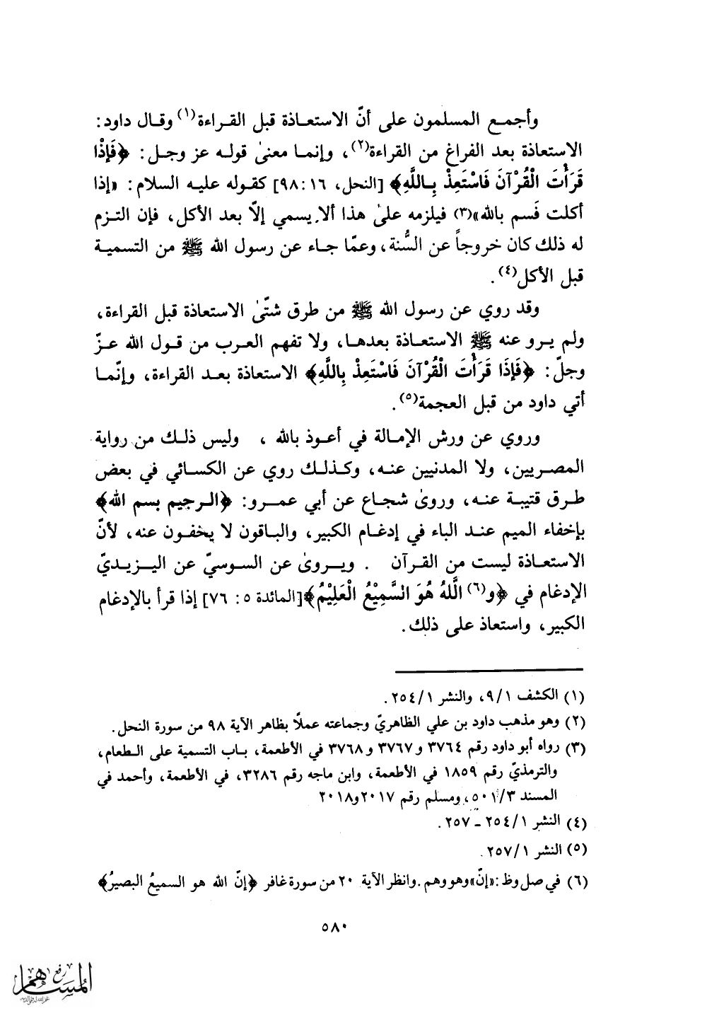 وقال داود: الاستعاذة بعد الفراغ من القراءة، وإنما معنى قوله عز وجل: (فَإِذَا قَرَأْتَ الْقُرْآنَ فَاسْتَعِذْ بِاللَّهِ مِنَ الشَّيْطَانِ الرَّجِيمِ (98) .