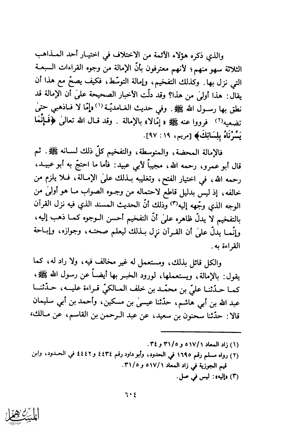 يقول: بالإمالة، ويستعملها، لورود الخبر بها أيضاً عن رسول الله - صلى الله عليه وسلم -، كما حدثنا على بن محمد بن خلف المالكي قراءة عليه، - حدثنا عبد الله بن أبي هاشم، حدثنا عيسى بن مسكين، وأحمد بن أبي سليمان قالا: حدثنا سحنون بن سعيد، عن عبد الرحمن بن القاسم، عن مالك،