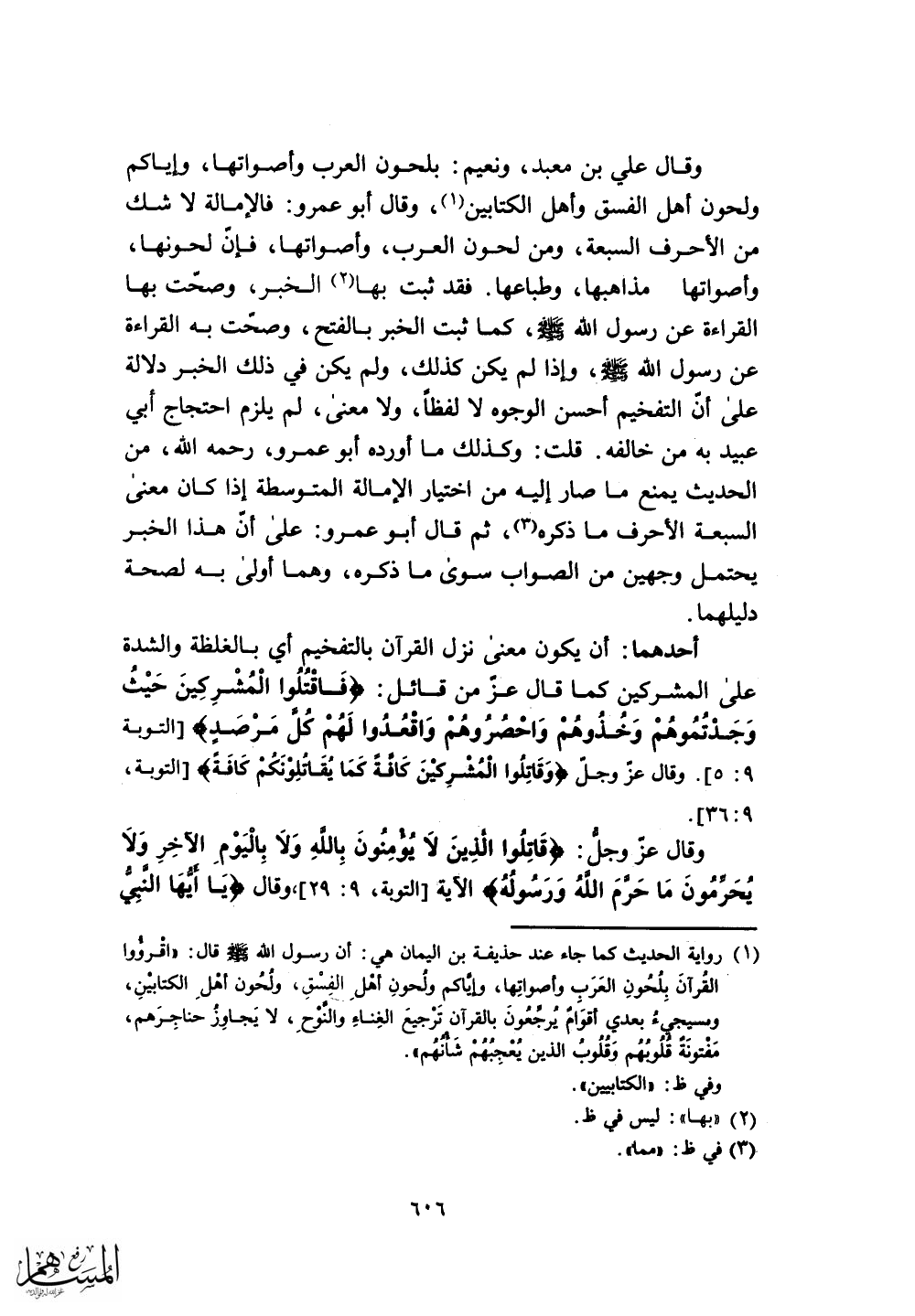 وقال علي بن معبد، ونعيم: بلحون العرب وأصواتها، وإياكم