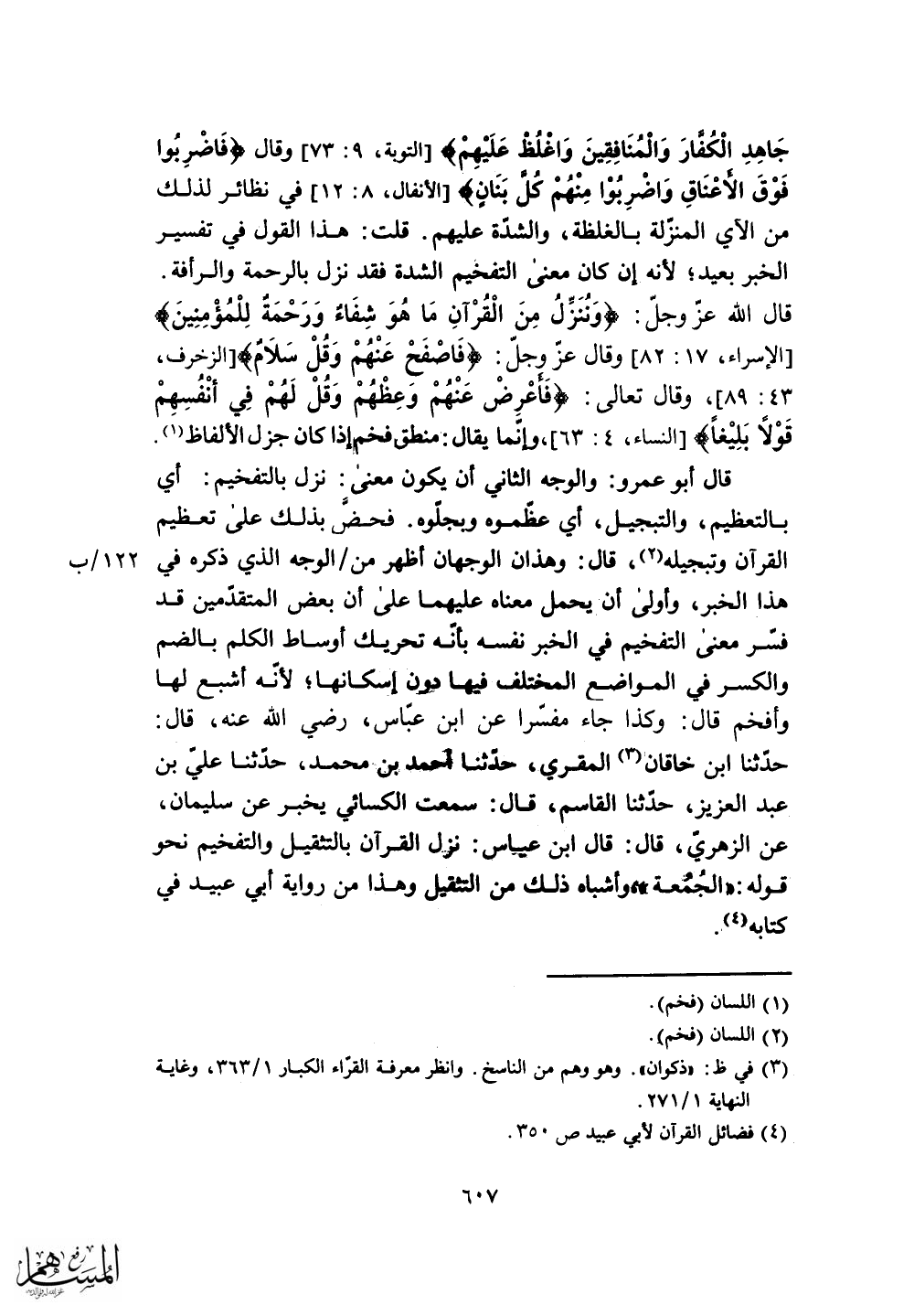 فحضَّ بذلك على تعظيم القرآن وتبجيله، قال: وهذان الوجهان أظهر من الوجه الذي ذكره في هذا الخبر، وأولى أن يحمل معناه عليهما على أن بعض المتقدمين قد فسَّر معنى التفخيم في الخبر نفسه بأنه تحريك أوساط الكلم بالضم والكسر في المواضع المختلف فيها دون إسكانها؛ لأنه أشبع لها