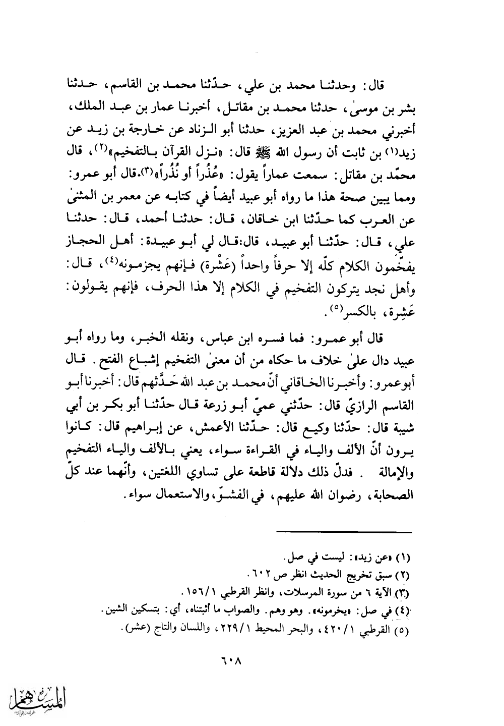 في كتابه عن معمر بن المثنى عن العرب كما حدثنا ابن خاقان، قال: حدثنا أحمد، قال: حدثنا علي، قال: حدثنا أبو عبيد، قال: قال لي أبو عبيدة: أهل الحجاز يفخمون الكلام كلّه إلا حرفاً واحداً (عَشْرة) فإنهم يجزمونه، قال: وأهل نجد يتركون التفخيم في الكلام إلا هذا الحرف، فإنهم يقولون:
