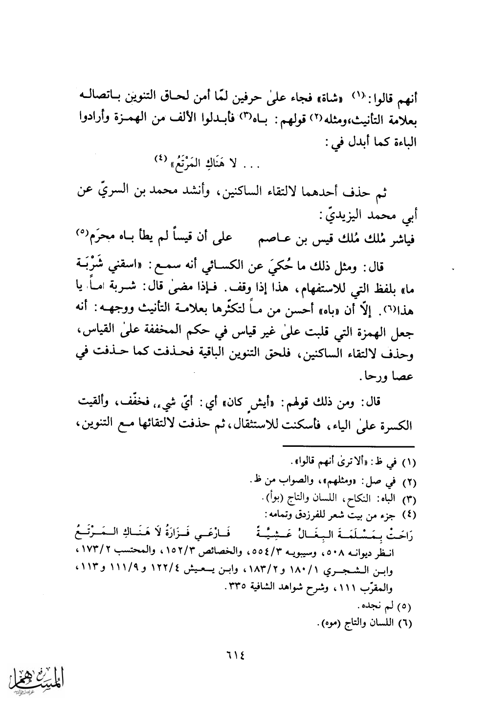 فإذا مضى قال: شربة إماً يا هذا. إلّا أن "باه" أحسن من ما لتكثرها بعلامة التأنيث ووجهه: أنه جعل الهمزة التي قلبت على غير قياس في حكم المخففة على القياس، وحذف لالتقاء الساكنين، فلحق التنوين الباقية فحذفت كما حذفت في عصا ورحا.